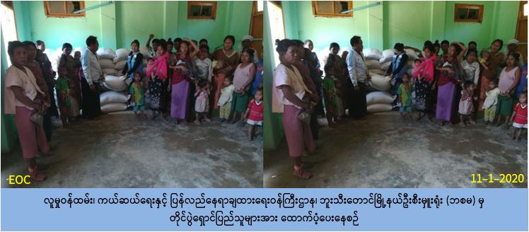 လူမှုဝန်ထမ်း၊ ကယ်ဆယ်ရေးနှင့်ပြန်လည်နေရာချထားရေး၀န်ကြီးဌာန၊ ဘေးအန္တရာယ်ဆိုင်ရာ စီမံခန့်ခွဲမှုဦးစီးဌာန၊ ဘူးသီးတောင်မြို့နယ်ဦးစီးမှူးရုံးမှ တာဝန်ရှိသူများသည် တိုက်ပွဲများ ဖြစ်ပွားမှုကြောင့်ဘူးသီးတောင်မြို့၊ ဂန္ဓာရီတောရပရဟိတကျောင်းတွင်ရိက္ခာထပ်မံလိုအပ်လျက် ရှိသော တိုက်ပွဲရှောင်ပြည်သူအိမ်ထောင်စု (၃၀) စု၊လူဦးရေ (၁၄၆) ဦးအတွက်ဆန်ရိက္ခာ (၁) လစာဆန် (၄၅) အိတ်၊ (၁၅) ပြည်အား (၁၁-၁-၂၀၂၀) ရက်နေ့တွင် ပြည်သူ့လက်ဝယ်အရောက် သွားရောက်ထောက်ပံ့ပေးအပ်ခဲ့ပါကြောင်း သိရှိရပါသည်။