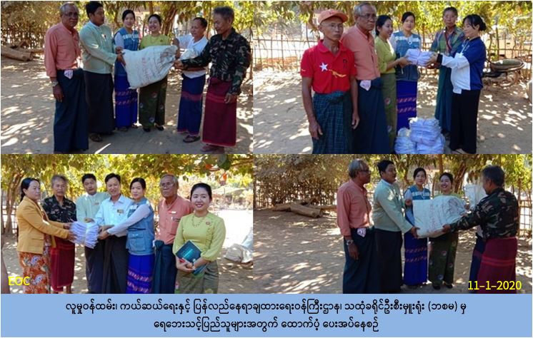 လူမှုဝန်ထမ်း၊ ကယ်ဆယ်ရေးနှင့်ပြန်လည်နေရာချထားရေး၀န်ကြီးဌာန၊ ဘေးအန္တရာယ်ဆိုင်ရာ စီမံခန့်ခွဲမှုဦးစီးဌာန၊ သထုံခရိုင်ဦးစီးမှူးရုံးမှ တာဝန်ရှိသူများသည် ၂၀၁၉ ခုနှစ်အတွင်း ရေဝင်ရောက်ခဲ့သည့် မွန်ပြည်နယ်၊ သထုံမြို့နယ်၊ ဆင်ကျုံးကျေးရွာမှ အိမ်ထောင်စု (၂၁၆) စု အတွက် ခြင်ဆေးခွေ (၂,၁၆၀) ခွေနှင့် ကလေးကျောင်းဝတ်စုံ ကျား (၁ရ၈) ထည်အားလည်းကောင်း ၊ ရွှေဘော်ကုန်းကျေးရွာမှ အိမ်ထောင်စု (၂၁၈) စုအတွက် ခြင်ဆေးခွေ (၁,၉၂၀) ခွေနှင့် ကလေးကျောင်းဝတ်စုံ ကျား (၁၁၂) ထည်၊ မ (၈၈) ထည်အားလည်းကောင်း၊ နောင်ကျန် ကျေးရွာမှအိမ်ထောင်စု (၁၈၀) စုအတွက် ခြင်ဆေးခွေ (၁,၈၀၀) ခွေ၊ ကလေးကျောင်းဝတ်စုံ ကျား (၁၈၆) ထည်တို့အား (၁၁-၁-၂၀၂၀) ရက်နေ့၊ (၁၄:၀၀) နာရီအချိန်တွင် ပြည်နယ်လွတ်တော်ကိုယ်စားလှယ်တို့နှင့်အတူ ထောက်ပံ့ပေးခဲ့ပါကြောင်း သိရှိရပါသည်။