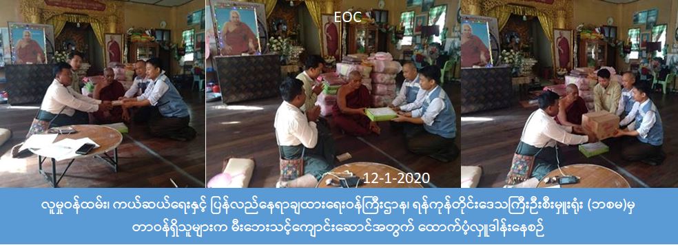 ရန်ကုန်တိုင်းဒေသကြီး၊ တောင်ပိုင်းခရိုင်၊ သန်လျင်မြို့နယ်၊ ဘုရားကုန်းကျေးရွာ၊ တောင်ဘက်မုဒ်ရှိ ကျောင်းထိုင် ဆရာတော် ဘဒ္ဒန္တပရမနှင့် သံဃာတော်(၈)ပါး၊ သီလရှင်(၄၆)ပါး သတင်းသုံးနေထိုင်သည့် ကံသာဓမ္မရိပ်သာ ကျောင်းဝန်းအတွင်းရှိ ကျောင်းဆောင်များမှ ဦးဇင်း၊ ဦးဝိမလ(ခ)ဦးမြဆင် နေထိုင်သော အဆောင်အမှတ်(၃၁)မှ ထမင်းပေါင်းအိုး အပူလွန်ကဲရာမှတဆင့် (၁၁-၁-၂၀၂၀) ရက်နေ့ (၁၃:၁၈)နာရီတွင် မီးလောင်ကျွမ်းခဲ့ရာ သွပ်မိုး၊ ပျဉ်ကာ ကျောင်းဆောင်(၂)လုံးနှင့် ကွန်ကရစ်ခင်း၊ သွပ်မိုး၊ ပျဉ်ကာ ဘာသာရေး ကျောင်းဆောင်(၁)လုံး၊ စုစုပေါင်း ဘာသာရေးကျောင်းဆောင်(၃)လုံး မီးလောင်ဆုံးရှုံးခဲ့ပါသဖြင့် ဘေးန္တရာယ်ဆိုင်ရာစီမံခန့်ခွဲမှုဦးစီးဌာန၊ ရန်ကုန် တိုင်းဒေသကြီးဦးစီးမှူးရုံးမှ ကျောင်းဆောက်ပစ္စည်းဖိုး (၉၀၀,၀၀ဝ) ကျပ်နှင့် သင်္ကန်း(၁၀)စုံ၊ သီလရှင်ဝတ်ရုံ (၁၀)ထုပ်၊ ဘီစကွပ်မှုန့် (၁၀) ဖာတို့အား (၁၂-၁-၂၀၂၀)ရက်နေ့ (၀၉:၁၅)နာရီတွင် မြို့နယ်ထွေ/အုပ်မှ တာဝန်ရှိ သူများနှင့်အတူ ထောက်ပံ့လှူဒါန်းခဲ့ကြောင်း သိရှိရပါသည်။