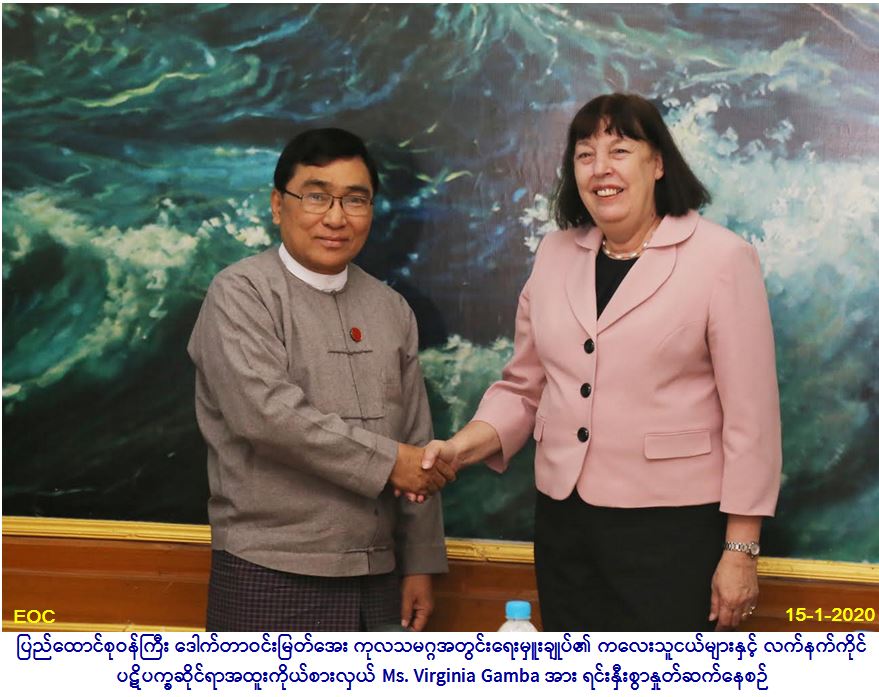 ထိုသို့တွေ့ဆုံရာတွင် ကလေးသူငယ်များနှင့်လက်နက်ကိုင် ပဋိပက္ခဆိုင်ရာကိစ္စရပ်များ နှင့်စပ်လျဉ်း၍ ပြည်ထောင်စုဝန်ကြီးက အထူး ကိုယ်စားလှယ်၏ ၂၀၁၈ ခုနှစ်၊ မေလ က လာရောက်ခဲ့သော ခရီးစဉ်နှင့် ယခုခရီးစဉ်အကြား များစွာသော တိုးတက်မှုများရှိပါကြောင်း၊ ကလေးသူငယ်အခွင့်အရေးများ ဆိုင်ရာဥပဒေ (၂၀၁၉) အား ပြဌာန်းနိုင်ခဲ့သလို လက်နက်ကိုင်ပဋိပက္ခများအတွင်း ကလေးသူငယ်များအား ကာကွယ် စောင့်ရှောက်ရန် ဥပဒေတွင် အခန်း(၁)ခန်း သီးခြားပါရှိပါကြောင်း၊ ၂၀၁၉ခုနှစ် စက်တင်ဘာလ(၂၇)ရက်နေ့ကလည်း ကလေးသူငယ်များ၏ အခွင့်အရေးဆိုင်ရာ ကုလသမဂ္ဂကွန်းဗင်းရှင်း (UN-CRC)၏ ပဋိပက္ခ အတွင်း ကလေးသူငယ်ဆိုင်ရာ ကိစ္စရပ်များနှင့်ပတ်သက်သည့် နောက်ဆက် တွဲအခြေပြ စာချုပ်ကို မြန်မာနိုင်ငံက လက်မှတ်ရေးထိုးခဲ့ပါကြောင်း၊ ထို့အပြင် ကလေးသူငယ်များအပေါ် ကြီးလေးသော ကျူးလွန်မှုများမှ ကာကွယ်တားဆီးရေးကော်မတီကို (၇.၁.၂၀၁၉) ရက်နေ့က ဖွဲ့စည်းခဲ့ပြီးဖြစ်ရာ အမျိုးသားအဆင့်လုပ်ငန်းစီမံချက်တစ်ရပ်ကို ရေးဆွဲဆောင်ရွက် နေပါကြောင်း၊ တပ်မတော်မှနှုတ်ထွက်ခွင့်ပေးလိုက်သော အရွယ်မရောက်သေးသူများ ပြန်လည်ထူထောင်ရေး လုပ်ငန်းများကိုလည်း ဆောင်ရွက် ပေးနေကြောင်း၊ မြန်မာနိုင်ငံ၏လူငယ်မူဝါဒတွင်လည်း အဆိုပါလူငယ်များကို အထူးကာကွယ်စောင့်ရှောက်ကူညီပေးရန်လိုအပ်သည့် အုပ်စုတွင် ထည့်သွင်းထားပါကြောင်း၊ ပဋိပက္ခများအတွင်းအမျိုးသမီးနှင့် မိန်းကလေးငယ်များ အပေါ် အကြမ်းဖက်မှုမှတားဆီးကာကွယ်တုံ့ပြန်နိုင်ရေးအတွက် ကိုလည်း ပူးတွဲကြေငြာချက်အား လက်မှတ်ရေးထိုး ဆောင်ရွက်လျက်ရှိပါကြောင်း၊ ငြိမ်းချမ်းရေးလုပ်ငန်းစဉ်များတွင်လည်း ကလေးသူငယ်များနှင့် ပတ်သက်သည့် ကာကွယ်စောင့်ရှောက်ရေး၊ ကလေးသူငယ်များအပေါ် ကြီးလေးသောကျူးလွန်မှုများပပျောက်စေရေး၊ ပညာရေး၊ ကျန်းမာရေး လက်လှမ်းမီစေရေး စသည့်အချက်များကိုထည့်သွင်း၍ ပြည်ထောင်စု၏သဘောတူညီချက် လက်ရှိ(၅၁)ချက်တွင် ပါဝင်ပါကြောင်းနှင့်ဒီမိုကရေစီ ဖက်ဒရယ်ပြည်ထောင်စုစနစ်ထူထောင်၍ ကလေးသူငယ်များ၏ အနာဂတ်ကောင်းမွန်စေရေး၊ ဖွံ့ဖြိုးတိုးတက်စေရေးတို့ကို ဆောင်ရွက်သွားမည် ဖြစ်ကြောင်း ပြောကြားခဲ့ပါသည်။