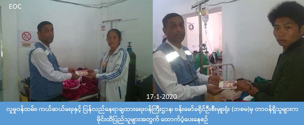 လူမှုဝန်ထမ်း၊ ကယ်ဆယ်ရေးနှင့် ပြန်လည်နေရာချထားရေးဝန်ကြီးဌာန၊ ဘေးအန္တရာယ်ဆိုင် ရာ စီမံခန့်ခွဲမှုဦးစီးဌာန၊ ဗန်းမော်ခရိုင်ဦးစီးမှူးရုံးမှ တာဝန်ရှိသူများသည် ဗန်းမော်ခရိုင်၊ မိုးမောက်မြို့နယ်၊ စိန်လုံကျေးရွာအုပ်စု၊ မရူကျေးရွာ၌ (၁၆-၁-၂၀၂၀) ရက်နေ့ (၁၂:၀၀) နာရီ အချိန်တွင် ဟင်းသီးဟင်းရွက်ရှာဖွေရန်သွားရာမှ မိုင်းနင်းမိပေါက်ကွဲခဲ့ရာ (၁)ဦးသေဆုံးပြီး (၂) ဦး ဒဏ်ရာရရှိခဲ့ပါသည်။ ထိုမိုင်းနင်းမိသေဆုံး (၁) ဦးအတွက်(၃၀၀,၀၀၀)နှင့် ဒဏ်ရာရသူ (၂)ဦး အတွက် (၁) ဦးလျှင် (၅၀,၀၀၀) ကျပ်နှုန်းဖြင့် (၁၀၀,၀၀၀) ကျပ်၊ စုစုပေါင်းထောက်ပံံ့ငွေ (၄၀၀,၀၀၀) ကျပ် တို့ကို (၁၇-၁-၂၀၂၀) ရက်နေ့ (၁၄:၀၀) နာရီအချိန်တွင် သွားရောက်ထောက်ပံ့ပေးခဲ့ကြောင်း သိရှိရပါသည်။