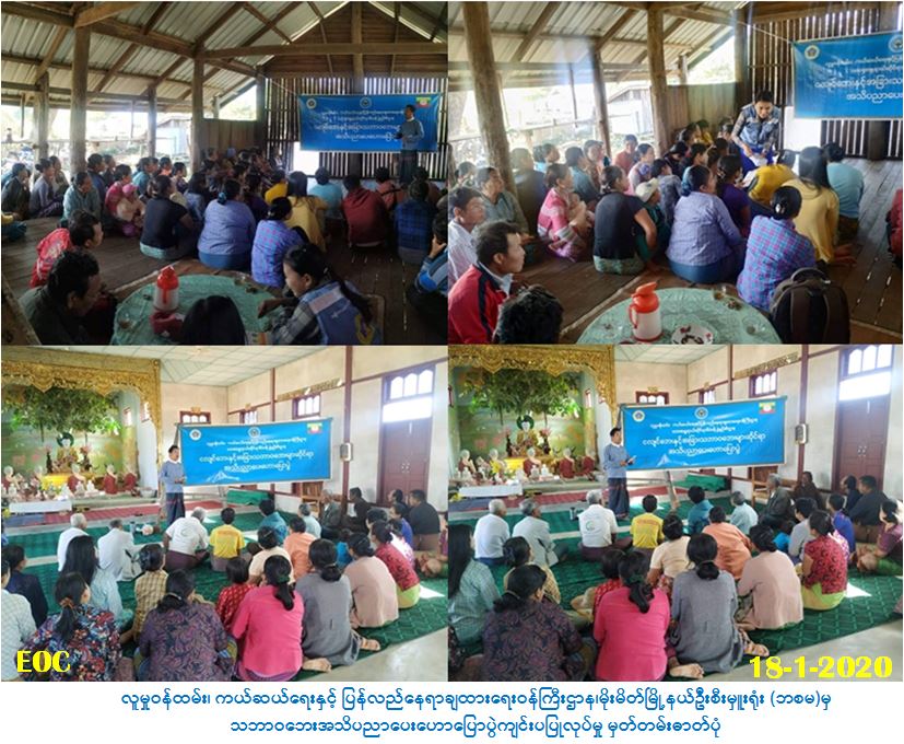 လူမှုဝန်ထမ်း၊ ကယ်ဆယ်ရေးနှင့် ပြန်လည်နေရာချထားရေးဝန်ကြီးဌာန၊ ဘေးအန္တရာယ်ဆိုင်ရာ စီမံခန့်ခွဲမှုဦးစီးဌာန၊ မိုးမိတ်မြို့နယ်ဦးစီးမှူးရုံးမှ တာဝန်ရှိသူများသည် (၁၈-၁-၂၀၂၀) ရက်နေ့၊ နံနက်(၁၁:၀၀)နာရီတွင် မိုးမိတ်မြို့နယ်၊ လက်ခုပ်ပင်ကျေးရွာအုပ်စု၊ ကွမ်းတောအင်းကျေးရွာနှင့် မွန်းလွဲ(၁၃:၀၀)နာရီတွင် ပဒါန်းကျေးရွာအုပ်စု၊ ပဒါန်းကျေးရွာတို့ရှိ ကျေးရွာနေပြည်သူလူထုများ အား ဝန်ကြီးဌာန၏ မူဝါဒများ၊ ဉီးစီးဌာန၏ လုပ်ငန်းတာဝန်များ၊ဘေးသင့်ပြည်သူများအတွက် ထောက်ပံ့မှုနှုန်းထားများ၊ ငလျင်ဘေးနှင့် အခြားသောသဘာဝဘေးအန္တရာယ်များ မဖြစ်ပွားမီ၊ ဖြစ်ပွားနေစဉ်၊ ဖြစ်ပွားပြီးနောက်ပိုင်းတွင် ဆောင်ရန်/ရှောင်ရန်များနှင့် စပ်လျဉ်း၍ အသိပညာပေး ဟောပြောပွဲ ကျင်းပခဲ့ရာ ကွမ်းတောအင်းကျေးရွာတွင် တက်ရောက်သူဉီးရေ (၁၀၀)ဉီးခန့်နှင့် ပဒါန်း ကျေးရွာတွင် (၇၅)ဉီးခန့် တက်ရောက်ခဲ့ပါကြောင်း သတင်းရရှိပါသည်။
