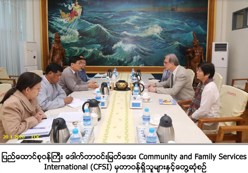 လူမှုဝန်ထမ်း၊ ကယ်ဆယ်ရေးနှင့် ပြန်လည်နေရာချထားရေးဝန်ကြီးဌာန၊ ပြည်ထောင်စုဝန်ကြီး ဒေါက်တာဝင်းမြတ်အေးအား Community and Family Services International(CFSI) နှင့် အပြည်ပြည် ဆိုင်ရာသက်ကြီးရွယ်အိုစောင့်ရှောက်ရေးအဖွဲ့ (HelpAge International (Myanmar)) အဖွဲ့အစည်းများက ယနေ့နံနက်ပိုင်းတွင် အဆိုပါဝန်ကြီးရုံး မေခလာခန်းမ၌ သီးခြားစီလာရောက် တွေ့ဆုံခဲ့ပါသည်။ Community and Services International(CFSI)နှင့်တွေ့ဆုံရာတွင် ဝန်ကြီးဌာနနှင့် CFSI အဖွဲ့အစည်း တို့ ပူးပေါင်း၍ လူမှုဝန်ထမ်း ဝန်ဆောင်မှုလုပ်ငန်းများနှင့် လူမှုကာကွယ် စောင့်ရှောက်ရေးလုပ်ငန်းများ ထိရောက်စွာ ဆောင်ရွက်ရာတွင် လိုအပ်သည့် လူ့စွမ်းအားအရင်း အမြစ်များ ဖွံ့ဖြိုးတိုးတက်ရေးအတွက် ကာလတို/ကာလရှည်သင်တန်းများအား CFSI အခြေစိုက် ဖိလစ်ပိုင်နိုင်ငံရှိ ဖိလစ်ပိုင်တက္ကသိုလ်အပါအဝင် နိုင်ငံတကာတက္ကသိုလ်များနှင့် ချိတ်ဆက် ဆောင်ရွက်နိုင်ရေးကိစ္စရပ်များ၊ လူမှုဝန်ထမ်းလုပ်ငန်းများအား ကျေးရွာအဆင့်အထိ ရောက်ရှိ နိုင်ရေး၊ လူမှုဝန်ထမ်းလုပ်အားပေးစေတနာ့ဝန်ထမ်းများပေါ်ထွက်ရေး၊ အဆိုပါ စေတနာ့ဝန်ထမ်း များအား လိုအပ်သောသင်တန်းများနှင့် နည်းပညာအကူအညီများပေးအပ်နိုင်ရေးနှင့် ရှေ့ဆက် ဆောင်ရွက်မည့် လုပ်ငန်းစဉ်များအတွက် နားလည်မှုစာချွန်လွှာ (MoU) ရေးထိုးဆောင်ရွက်ရေးနှင့် စပ်လျဉ်း၍ တွေ့ဆုံ ဆွေးနွေးခဲ့ပါသည်။