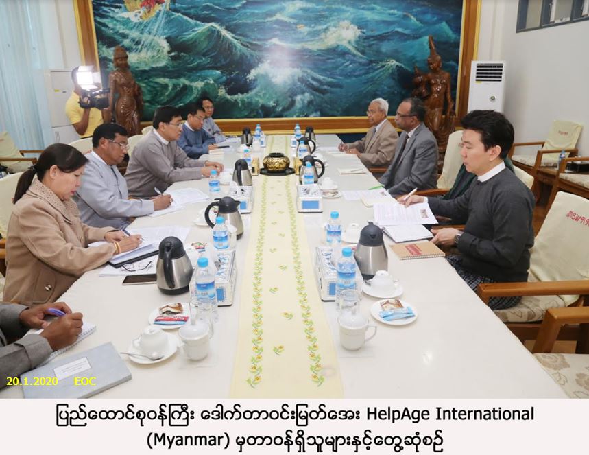 ဆက်လက်၍ အပြည်ပြည်ဆိုင်ရာသက်ကြီးရွယ်အိုစောင့်ရှောက်ရေးအဖွဲ့ (HelpAge International (Myanmar)) တွေ့ဆုံရာတွင် လူမှုဝန်ထမ်း၊ ကယ်ဆယ်ရေးနှင့် ပြန်လည်နေရာ ချထားရေးဝန်ကြီးဌာနအနေဖြင့် သက်ကြီးရွယ်အိုအခွင့်အရေးများ ဖေါ်ဆောင်ပေးရေးနှင့် ကောင်းမွန်သော သက်ကြီးရွယ်အိုဘဝ ရရှိစေရေးအတွက် သက်ကြီးရွယ်အိုများဆိုင်ရာဥပဒေကို ၂၀၁၆ခုနှစ်၊ ဒီဇင်ဘာလက ပြဌာန်းခဲ့ပြီးဖြစ်ရာ သက်ဆိုင်ရာနည်းဥပဒေများပေါ်ထွက်လာရေး၊ သက်ကြီးရွယ်အိုဆိုင်ရာမူဝါဒရေးဆွဲဆောင်ရွက်နိုင်ရေး၊ ဥပဒေ၊ နည်းဥပဒေနှင့်မူဝါဒများကို အကောင်အထည်ဖေါ်ရန် မဟာဗျူဟာရေးဆွဲ၍ အကောင်အထည်ဖေါ်ဆောင်ရွက်ရေး စသည့် လုပ်ငန်းစဉ်များတွင် HAI အဖွဲ့အစည်းအနေဖြင့် လိုအပ်သည့်နည်းပညာနှင့် ဘဏ္ဍာရေးဆိုင်ရာ အကူအညီများပေးအပ်၍ ပူးပေါင်းဆောင်ရွက်နိုင်ရေးကိစ္စရပ်များ၊ လူမှုအားမာန်အဖွဲ့ Inclusive Self – Help Group (ISHG) အဖွဲ့အစည်းများ ဖွဲ့စည်းဆောင်ရွက်နေမှုနှင့် ရှေ့ဆက် ဆောင်ရွက်မည့် လုပ်ငန်းစဉ်များ၊ မိသားစုမှ စောင့်ရှောက်မပေးနိုင်သည့် လမ်းပေါ်နေ သက်ကြီးရွယ်အိုများအား ထောက်ပံ့ကူညီ၍ ပြန်လည်ထူထောင်ရေးဆောင်ရွက်ပေးနိုင်မည့် အခြေအနေများနှင့် သက်ကြီးရွယ်အိုများနှင့် မသန်စွမ်းမှုဆိုင်ရာ ကိစ္စရပ်များကို ပူးတွဲဆောင်ရွက်နိုင်မည့် အခြေအနေများနှင့် စပ်လျဉ်း၍ တွေ့ဆုံဆွေးနွေးခဲ့ကြကြောင်း သတင်းရရှိပါသည်။