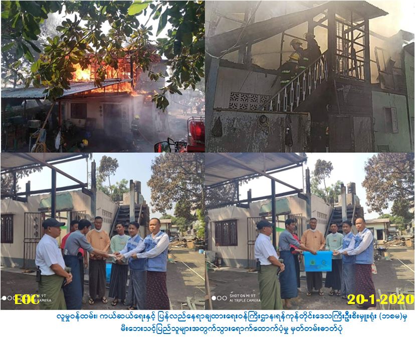 လူမှုဝန်ထမ်း၊ ကယ်ဆယ်ရေးနှင့် ပြန်လည်နေရာချထားရေးဝန်ကြီးဌာန၊ ဘေးအန္တရာယ်ဆိုင်ရာ စီမံခန့်ခွဲမှုဦးစီးဌာန၊ ရန်ကုန်တိုင်းဒေသကြီးဦးစီးမှူးရုံးမှ တာဝန်ရှိသူများသည် (၁၈-၁-၂၀၂၀) ရက် နေ့ (၁၃:၀၅) နာရီချိန်၌ ရန်ကုန်တိုင်းဒေသကြီး၊ မြောက်ပိုင်းခရိုင် ၊အင်းစိန်မြို့နယ်၊ စဉ့်ငူရပ်ကွက်၊ အောက်မင်္ဂလာဒုံလမ်းမကြီး၊ အိမ်အမှတ်(၇၂၅)ရှိ ပိုင်ရှင် ဦးတိုးရီ၏ နေအိမ်တွင် ဝါယာရှော့မှ တဆင့် မီးစတင်လောင်ကျွမ်းခဲ့ရာ နေအိမ်(၁)လုံး မီးလောင်ကျွမ်းခဲ့ပြီး အိမ်ထောင်စု(၁) စုမှ လူဦးရေ (၃)ဦးတို့ မီးဘေးသင့်ခဲ့ပါသဖြင့် အိမ်ဆောက်ပစ္စည်းဖိုးထောက်ပံ့ငွေ(၂၀၀,၀၀ဝ/-)ကျပ်၊ ဆန်ရိက္ခာ (၇)ရက်စာဖိုးထောက်ပံ့ငွေ (၆,၃၀ဝ/-)ကျပ်၊ စုစုပေါင်းထောက်ပံ့ဖိုးငွေ(၂၀၆,၃၀ဝ/-) ကျပ်နှင့် ကယ်ဆယ်ရေးပစ္စည်း(၁၆) မျိုး (၁) အိမ်ထောင်စုစာတို့အား (၂၀-၁-၂၀၂၀)ရက်နေ့ (၁၁:၀၀) နာရီ ချိန်တွင် ဘေးသင့်ပြည်သူတို့၏ လက်ဝယ်သို့ သွားရောက် ထောက်ပံ့ ပေးခဲ့ပါကြောင်း သတင်းရရှိ ပါသည်။
