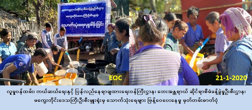 လူမှုဝန်ထမ်း၊ ကယ်ဆယ်ရေးနှင့် ပြန်လည်နေရာချထားရေး၀န်ကြီးဌာန၊ ဘေးအန္တရာယ် ဆိုင်ရာစီမံခန့်ခွဲမှုဦးစီးဌာန၊ မကွေးတိုင်းဒေသကြီးဦးစီးမှူးရုံးမှ တာဝန်ရှိသူများသည် သောက်သုံးရေ ရှားပါးမှုအခက်အခဲကြုံတွေ့နေရသော မကွေးမြို့နယ်၊ ကြာကန်ကျေးရွာ အုပ်စု၊ ကြာကန်ကျေးရွာ ဦးဝင်းကြည်တဲတိုက်၊ အောင်ချမ်းသာကွက်သစ်၊ အရှေ့ပိုင်းနှင့် တောင်ပိုင်းတို့မှ အိမ်ခြေ (၁၁၃) လုံး၊ အိမ်ထောင်စု (၁၂၈) စု၊ လူဦးရေ (၆၁၇) ဦးတို့အတွက် သောက်သုံးရေဂါလံ (၆၀၀၀) အား (၂၁-၁-၂၀၂၀) ရက်နေ့ (၁၀ : ၃၀) နာရီအချိန်တွင် တဲတိုက်များအရောက် သောက်သုံးရေများ သွားရောက်ဖြန့်ဝေပေးခဲ့ကြောင်း သတင်းရရှိပါ သည်။