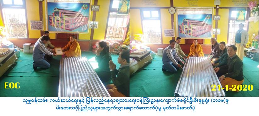 လူမှုဝန်ထမ်း၊ ကယ်ဆယ်ရေးနှင့် ပြန်လည်နေရာချထားရေးဝန်ကြီးဌာန၊ ဘေးအန္တရာယ်ဆိုင်ရာ စီမံခန့်ခွဲမှုဦးစီးဌာန၊ ကျောက်မဲခရိုင်ဦးစီးမှူးရုံးမှ တာဝန်ရှိသူများသည် (၂-၁၀-၂၀၁၉) ရက်နေ့တွင် သီပေါမြို့နယ်၊ မိုင်းလင်းကျေးရွာအုပ်စုတွင် မီးလောင်မှုကြောင့် ပျက်စီးခဲ့သော မြောက်ရွာ ဘုန်းတော်ကြီးကျောင်း၌ အသစ်ပြန်လည်တည်ဆောက်ရေးအတွက် လိုအပ်သော (၁၁လိုင်းပါ ၇ပေ) အမိုးသွပ် (၄၀၀) ချပ်အား (၂၁-၁-၂၀၂၀) ရက်နေ့(၁၀:၀၀) နာရီအချိန်တွင် သွားရောက်ထောက်ပံ့ လှူဒါန်းခဲ့ပါကြောင်း သတင်းရရှိပါသည်။