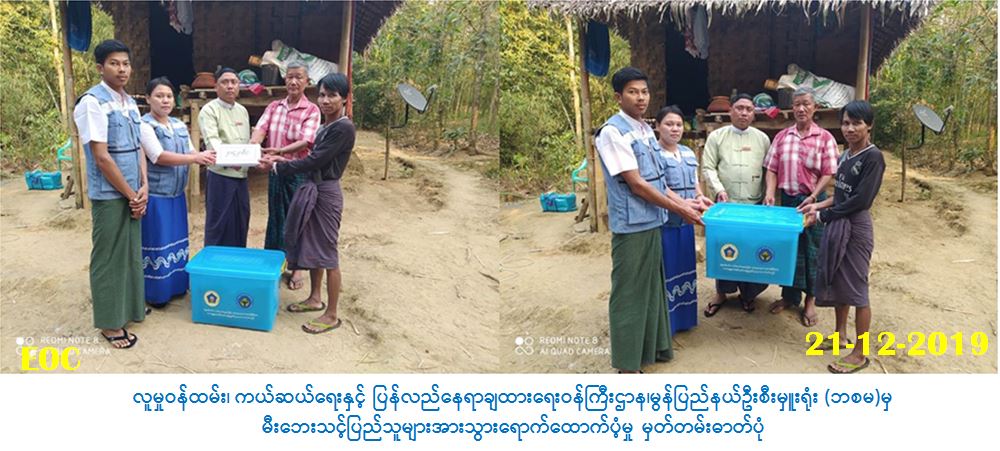 လူမှုဝန်ထမ်း၊ ကယ်ဆယ်ရေးနှင့်ပြန်လည်နေရာချထားရေးဝန်ကြီးဌာန၊ ဘေးအန္တရာယ်ဆိုင်ရာ စီမံခန့်ခွဲမှုဦးစီးဌာန၊ ချောင်းဆုံမြို့နယ်ဉီးစီးမှူးရုံးမှ တာဝန်ရှိသူများသည် (၂၀-၁-၂၀၂၀)ရက်နေ့တွင် ချောင်းဆုံမြို့နယ်၊ တကူပတီကျေးရွာအုပ်စု၌ မီးလောင်ကျွမ်းမှုကြောင့် ပျက်စီးဆုံးရှုံးခဲ့သည့် လူနေ အိမ်(၁)လုံးအတွက် အိမ်ဆောက်ပစ္စည်းဖိုးထောက်ပံ့ငွေ(၂၀၀၀၀ဝ/-)ကျပ်၊ ဘေးသင့်လူဉီးရေ (၂)ဉီး အတွက်(၇)ရက်စာဆန်ထောက်ပံ့ဖိုးငွေ (၄၂၀ဝ/-)ကျပ်၊ စုစုပေါင်းထောက်ပံ့ဖိုးငွေ (၂၀၄၂၀ဝ/-) ကျပ် နှင့် ကယ်ဆယ်ရေးပစ္စည်း(၁၆)မျိုးတို့အား (၂၁-၁-၂၀၂၀)ရက်နေ့တွင် မီးဘေးသင့်ပြည်သူများထံ လက်ဝယ်အရောက်သွားရောက်ထောက်ပံ့ပေးအပ်ခဲ့ပါကြောင်းသတင်းရရှိပါသည်။