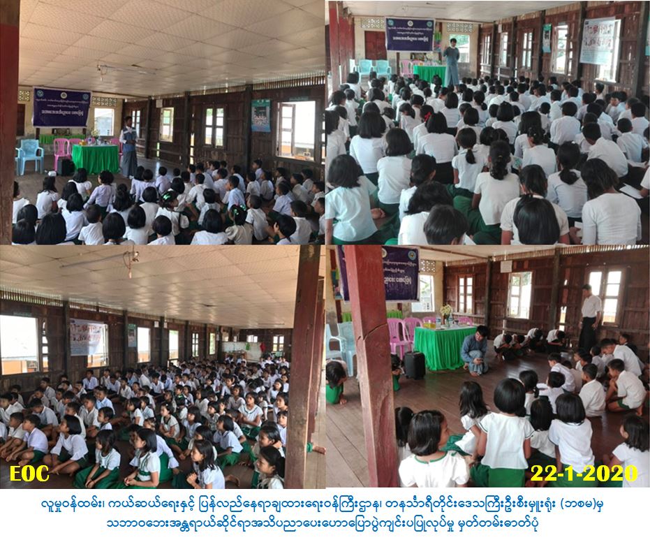 လူမှု၀န်ထမ်း၊ ကယ်ဆယ်ရေးနှင့် ပြန်လည်နေရာချထားရေး၀န်ကြီးဌာန၊ ဘေးအန္တရာယ်ဆိုင်ရာ စီမံခန့်ခွဲမှုဦးစီးဌာန၊ တနင်္သာရီတိုင်းဒေသကြီးဦးစီးမှူးရုံးမှ တာဝန်ရှိသူများသည် (၂၂-၁-၂၀၂၀) ရက် နေ့တွင် ရေဖြူမြို့နယ်၊အလက(ကျောက်ထောင့်) စာသင်ကျောင်း၌ သဘာဝဘေးအန္တရာယ်နှင့် ပတ်သက်၍ အသိပညာပေးဟောပြောပွဲပြုလုပ်ခဲ့ရာ ကျောင်းသား/သူ(၁၇၅)ဦး တက်ရောက်ခဲ့ပါ ကြောင်းနှင့် လက်ကမ်းစာစောင်များ၊သရုပ်ပြခြင်းများဆောင်ရွက်ခဲ့ပါကြောင်း သတင်းရရှိပါသည်။