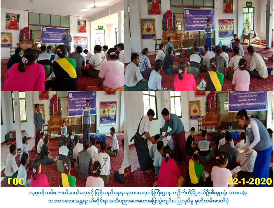 န်ထမ်း၊ ကယ်ဆယ်ရေးနှင့် ပြန်လည်နေရာချထားရေး၀န်ကြီးဌာန၊ ဘေးအန္တရာယ်ဆိုင်ရာ စီမံခန့်ခွဲမှုဦးစီးဌာန၊ မွန်ပြည်နယ်၊ သထုံခရိုင်၊ ကျိုက်ထိုမြို့နယ်ဦးစီးမှူးရုံးမှ တာ၀န်ရှိသူများသည် (၂၂-၁-၂၀၂၀)ရက်နေ့၊ (၁၃:၀၀)နာရီမှ (၁၄:၃၀)နာရီအထိ မလော့ချောင်ကျေးရွာအုပ်စု၊ ရွာလယ် ဓမ္မာရုံတွင် ဘေးအန္တရာယ်လျော့ပါးရေးဆိုင်ရာအသိပညာပေးဟောပြောဆွေးနွေးခြင်းအား ကျင်းပ ပြုလုပ်ခဲ့ရာ ပြည်သူလူထု (၁၅၀)ဦးခန့်တက်ရောက်ခဲ့ပါကြောင်း သတင်းရရှိပါသည်။