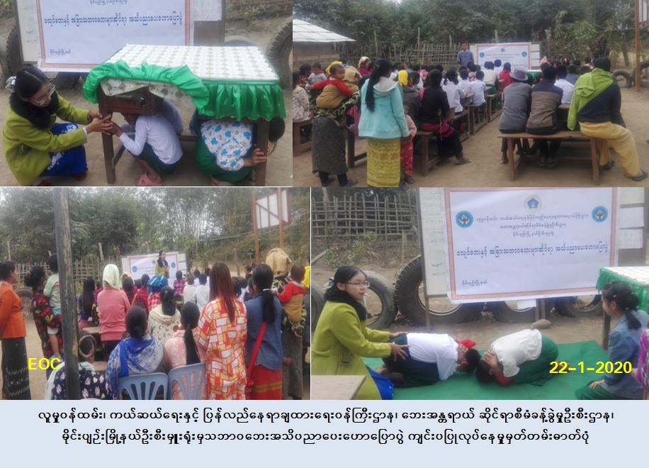 လူမှုဝန်ထမ်း၊ ကယ်ဆယ်ရေးနှင့် ပြန်လည်နေရာချထားရေးဝန်ကြီးဌာန၊ ဘေးအန္တရာယ် ဆိုင်ရာစီမံခန့်ခွဲမှုဦးစီးဌာန၊ မိုင်းပျဉ်းမြို့နယ်ဦးစီးမှူးရုံးမှ တာဝန်ရှိသူများသည် (၂၂ – ၁ -၂၀၂၀ ) ရက်နေ့ တွင် ( ၀၉ : ၀၀ ) အချိန်မှ ( ၁၀ : ၃၀ ) နာရီ အချိန်ထိ မိုင်းပျဉ်းမြို့နယ်၊ ဟောင်ကန်ကျေးရွာအုပ်စု၊ ဝမ်ကန်ကျေးရွာ အခြေခံပညာမူလတန်းကျောင်းတွင် ဆရာ / မ များ၊ ကျောင်းသား / သူများနှင့် ပြည်သူလူထုစုစုပေါင်း (၈၀) ဦး အားသဘာဝဘေး အသိပညာပေးဟောပြောပွဲပြုလုပ်၍ ဦးစီးဌာန၏လုပ်ငန်းတာဝန်များ၊ ရည်ရွယ်ချက်များ၊ ထောက်ပံ့မှုနှုန်းထားများ၊ ဘေး (၈) မျိုး အကြောင်း ဆောင်ရန်/ ရှောင် ရန်များ၊ ငလျင် လှုပ်ခတ်စဉ်အတွင်း နေထိုင်ရမည့်အနေအထားများအား လက်တွေ့သရုပ်ပြခြင်း၊ လက် ကမ်းစာစောင် ဖြန့်ဝေပေးခြင်းများကို ဆောင်ရွက်ခဲ့ပါကြောင်း သတင်းရရှိပါ သည်။