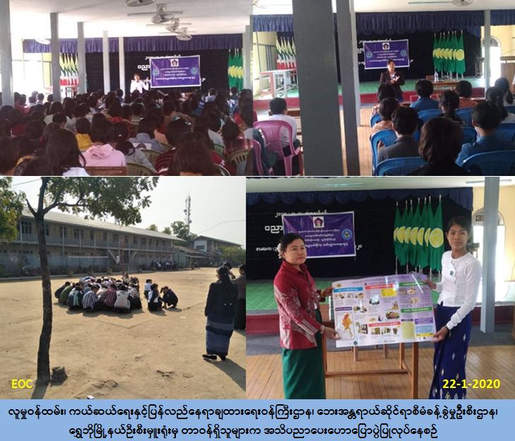 လူမှုဝန်ထမ်း၊ ကယ်ဆယ်ရေးနှင့် ပြန်လည်နေရာချထားရေးဝန်ကြီးဌာန၊ ဘေးအန္တရာယ် ဆိုင်ရာစီမံခန့်ခွဲမှုဦးစီးဌာန၊ ရွှေဘိုခရိုင်ဦးစီးမှူးရုံးမှ တာဝန်ရှိသူများသည် (၂၂-၁-၂၀၂၀) ရက်နေ့၊ နေ့လည်(၁၃:၀၀)နာရီမှ (၁၄:၃၀)နာရီအထိ ရွှေဘိုမြို့၊ အမှတ်(၃) အခြေခံပညာ အထက်တန်းကျောင်း၌ ကျောင်းသား/သူ (၃၀၀) ဦးတို့အား သဘာဝဘေးအသိပညာပေး ဆွေးနွေးဟောပြောခဲ့ပြီး သဘာဝဘေးအန္တရာယ်ဆိုင်ရာ ဆောင်ရန်/ရှောင်ရန်လက်ကမ်း စာစောင် များဖြန့်ဝေခဲ့ပါကြောင်း သတင်းရရှိပါသည်။