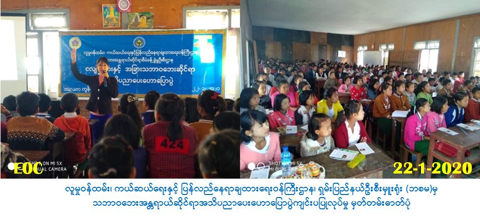 လူမှုဝန်ထမ်း၊ ကယ်ဆယ်ရေးနှင့်ပြန်လည်နေရာချထားရေးဝန်ကြီးဌာန၊ ဘေးအန္တရာယ်ဆိုင်ရာ စီမံခန့်ခွဲမှုဦးစီးဌာန၊ ရှမ်းပြည်နယ်ဦးစီးမှူးရုံးမှ တာဝန်ရှိသူများသည် (၂၂-၁-၂၀၂၀)ရက်နေ့ နံနက် (၀၉:၃၀) အချိန်မှ(၁၁:၀၀) အချိန်ထိတောင်ကြီးမြို့နယ်၊အလက ကွန်လုံကျောင်းသား/သူ(၃၀၀)ဦး အား သဘာဝဘေးအသိပညာပေးဟောပြောပွဲပြုလုပ်ခဲ့ပြီးလက်ကမ်းစာစောင်များ ဖြန့်ဝေခြင်း၊ ပညာပေးဗွီဒီယိုပြသခြင်း၊ သရုပ်ပြသခြင်းများအား ပြုလုပ်နိုင်ခဲ့ပါကြောင်း သတင်းရရှိပါသည်။