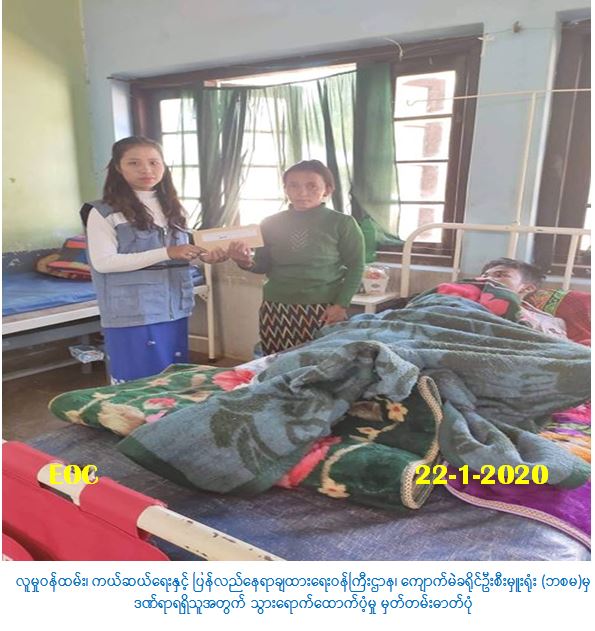 လူမှုဝန်ထမ်း၊ ကယ်ဆယ်ရေးနှင့်ပြန်လည်နေရာချထားရေးဝန်ကြီးဌာန၊ ဘေးအန္တရာယ်ဆိုင်ရာ စီမံခန့်ခွဲမှုဦးစီးဌာန၊ ကျောက်မဲခရိုင်ဦးစီးမှူးရုံးမှ တာဝန်ရှိသူများသည် (၂၁-၁-၂၀၂၀)ရက်နေ့၌ ကျောက်မဲမြို့နယ်၊ တော့ဆန်ကျေးရွာအုပ်စု၊ တော့ဆန်ရွာ၀င်အနီးတွင် မိုင်းနင်းမိ၍ ဒဏ်ရာရရှိသူ (၁)ဦးအတွက် ထောက်ပံ့ဖိုးငွေ (၅၀,၀၀၀/-)ကျပ်အား (၂၂-၁-၂၀၂၀)ရက်နေ့(၁၀:၃၀)နာရီအချိန်တွင် ကျောက်မဲမြို့ပြည်သူ့ဆေးရုံကြီး၌ ပြည်သူများထံလက်၀ယ်အရောက် ထောက်ပံ့ပေးအပ်ခဲ့ပါကြောင်း သတင်းရရှိပါသည်။