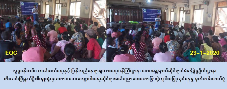လူမှုဝန်ထမ်း၊ ကယ်ဆယ်ရေးနှင့် ပြန်လည်နေရာချထားရေးဝန်ကြီးဌာန၊ ဘေးအန္တရာယ် ဆိုင်ရာစီမံခန့်ခွဲမှုဦးစီးဌာန၊ ဘီးလင်းမြို့နယ်ဦးစီးမှူးရုံးမှ တာဝန်ရှိသူများသည် (၂၃ – ၁ – ၂၀၂၀ ) ရက်နေ့၊ ( ၁၀ : ၀၀ )နာရီမှ ( ၁၁ : ၃၀ ) နာရီအချိန်အထိ ဘီးလင်းမြို့ ၊ဘုးရာ ဇရပ်ကွက်၊ လေသာကျောင်းဘုန်းကြီးကျောင်း၌ သဘာဝဘေးအန္တရာယ်လျော့ပါးရေး ဆိုင်ရာ အသိပညာပေးဆွေးနွေးဟောပြောပွဲ ကျင်းပပြုလုပ်ခဲ့ရာ ပြည်သူလူ ထု (၁၀၀) ဦး ခန့်တက်ရောက်ခဲ့ပြီး လက်ကမ်းစာစောင်များ ဖြန့်ဝေပေးခဲ့ပါကြောင်း သတင်းရရှိပါသည်။