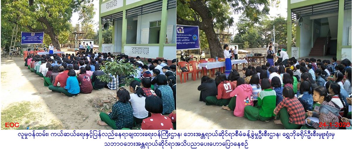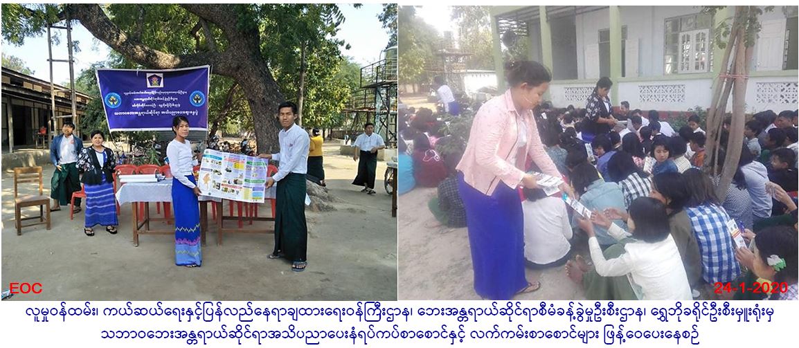လူမှုဝန်ထမ်း၊ ကယ်ဆယ်ရေးနှင့်ပြန်လည်နေရာချထားရေးဝန်ကြီးဌာန၊ ဘေးအန္တရာယ်ဆိုင်ရာစီမံခန့်ခွဲမှုဦးစီးဌာန၊ ရွှေဘိုခရိုင် ဦးစီးမှူးရုံးမှ တာဝန်ရှိသူများသည် (၂၄-၁-၂၀၂၀) ရက်နေ့ နေ့လည် (၁၃:၀၀) နာရီမှ (၁၄:၃၀)နာရီအထိ ရွှေဘိုမြို့၊ အ.လ.က(၁) အခြေခံပညာအထက်တန်းကျောင်း(ခွဲ)၌ ကျောင်းသား/ သူ(၅၀၀)ဦးတို့အား သဘာဝဘေးအသိပညာပေး ဆွေးနွေးဟောပြော ခဲ့ပြီး၊ သဘာဝဘေးအန္တရာယ်ဆိုင်ရာ ဆောင်ရန်/ရှောင်ရန် လက်ကမ်းစာစောင်များဖြန့်ဝေခဲ့ပါကြောင်း သတင်းရရှိပါသည်။