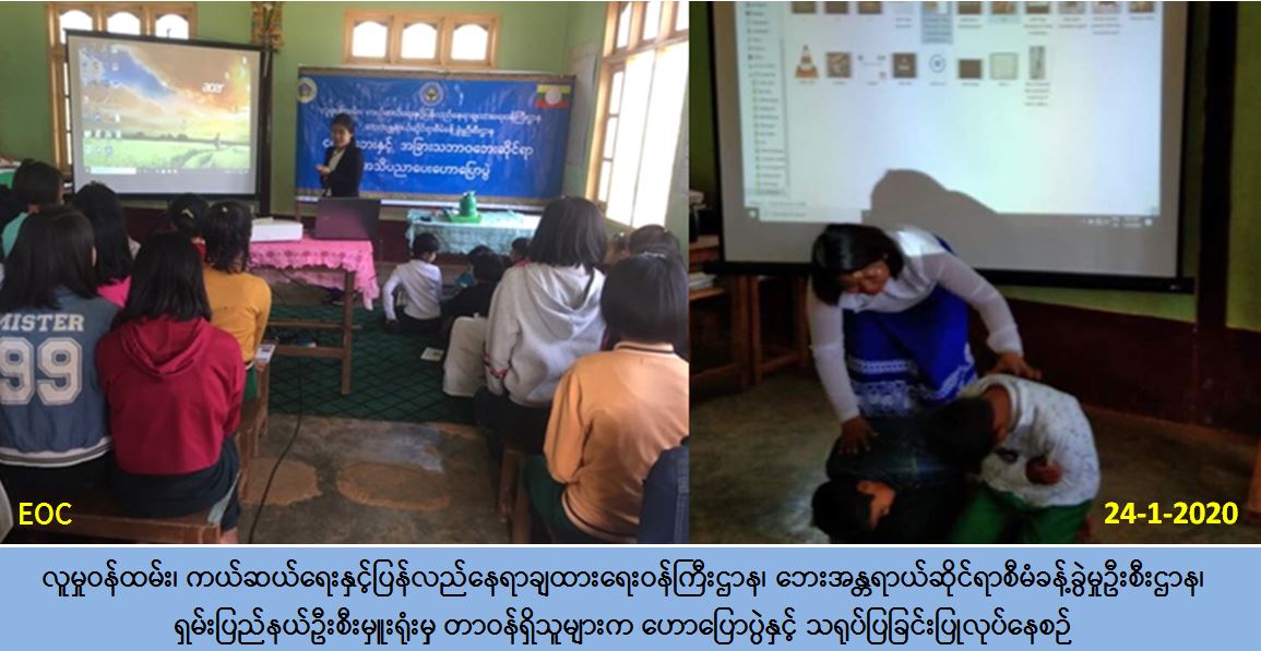 လူမှုဝန်ထမ်း၊ ကယ်ဆယ်ရေးနှင့်ပြန်လည်နေရာချထားရေးဝန်ကြီးဌာန၊ ဘေးအန္တရာယ်ဆိုင် ရာစီမံခန့်ခွဲမှုဦးစီးဌာန ရှမ်းပြည်နယ်ဦးစီးမှူးရုံးမှ တာဝန်ရှိသူများသည် (၂၄-၁-၂၀၂၀) ရက် နေ့ နံနက်(၀၉:၃၀) နာရီအချိန်မှ (၁၁:၀၀) နာရီ အချိန်ထိ ဟိုပုံးမြို့နယ် (အ.လ.က) စအွန် ကျောင်းသား၊ ကျောင်းသူ (၁၀၀) ဦး အားသဘာဝဘေးအသိပညာပေး ဟောပြောပွဲ ပြုလုပ် ခဲ့ပြီး လက်ကမ်းစာစောင်များ ဖြန့်ဝေခြင်း၊ ပညာပေးဗွီဒီယိုပြသခြင်း၊ သရုပ်ပြသခြင်းများ ပြုလုပ်ခဲ့ပါကြောင်း သတင်းရရှိပါသည်။