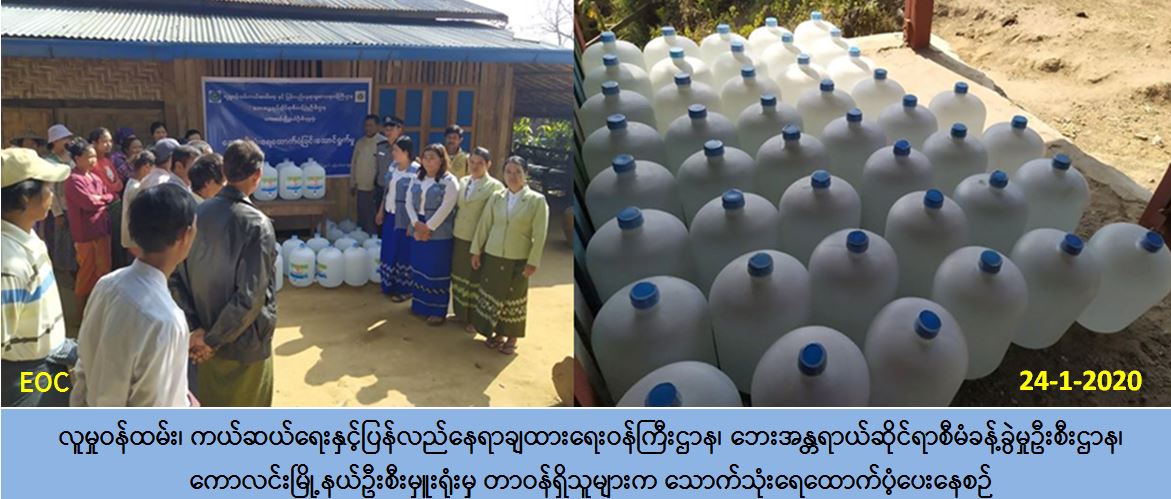 ၊ ကယ်ဆယ်ရေးနှင့်ပြန်လည်နေရာချထားရေးဝန်ကြီးဌာန၊ ဘေးအန္တရာယ်ဆိုင် ရာစီမံခန့်ခွဲမှုဦးစီးဌာန၊ ကောလင်းမြို့နယ်ဦးစီးမှူးရုံးမှ တာဝန်ရှိသူများသည် (၂၄-၁-၂၀၂၀) ရက်နေ့ (၉:၃၀) နာရီအချိန်တွင် ဝန်းသိုမြို့နယ်၊ နမ်းခမ်းကျေးရွာအုပ်စု၊ ဘုံချောင်းကျေးရွာ သို့ သောက်ရေသန့် အိမ်ထောင်စု(၁)စုလျှင် (၂၀)လီတာဆံ့ဘူးကြီး (၄) ဘူးစီဖြင့် အိမ်ထောင် စု (၇၀) စု၊ လူဦးရေ(၃၂၀) ဦးအတွက် ရေသန့်ဘူးကြီး စုစုပေါင်း (၂၈၀) ဘူးအား ထောက်ပံ့ ခဲ့ကြောင်း သတင်းရရှိပါသည်။