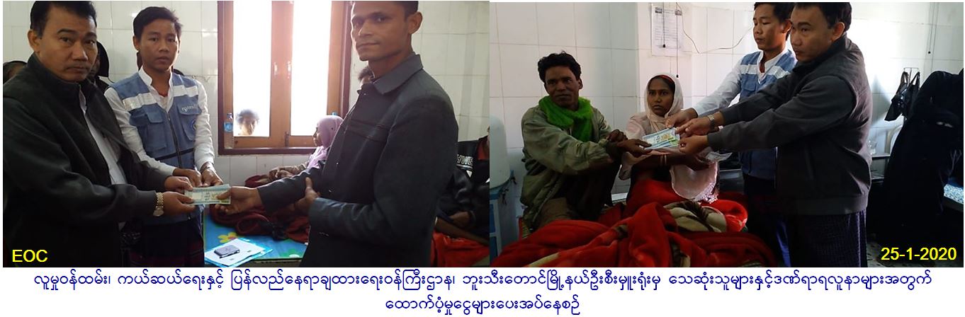 လူမှုဝန်ထမ်း၊ ကယ်ဆယ်ရေးနှင့် ပြန်လည်နေရာချထားရေးဝန်ကြီးဌာန၊ ဘူးသီးတောင်မြို့နယ်ဦးစီးမှူးရုံးမှ တာဝန်ရှိသူများသည် လက်နက်ကြီး ကျည်ကျရောက်မှုကြောင့် ဘူးသီးတောင်မြို့နယ်၊ ကင်းတောင်ကျေးရွာအုပ်စု၊ ကင်းတောင်ကျေးရွာနေ၌ သေဆုံးသူ (၂) ဦးအတွက် (၁)ဦးလျှင် (၃၀၀၀၀၀/-)ကျပ်နှုန်းဖြင့် (၆၀၀၀၀၀/) ကျပ်နှင့် ဒဏ်ရာရရှိသူ(၇)ဦးအတွက် (၁)ဦးလျှင်(၅၀၀၀၀/-)ကျပ်နှုန်းဖြင့် (၃၅၀၀၀၀/-)ကျပ်၊ စုစုပေါင်း ထောက်ပံ့ငွေ (၉၅၀၀၀၀/-)ကျပ်တို့ကို (၂၅-၁-၂၀၂၀)ရက်နေ့တွင် ထောက်ပံ့ပေးအပ်ခဲ့ပါကြောင်း သတင်းရရှိပါသည်။