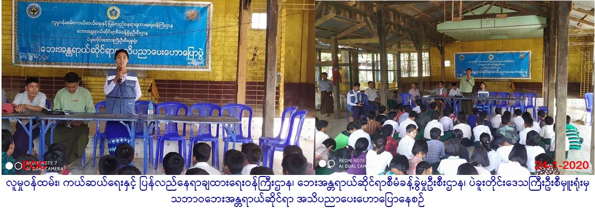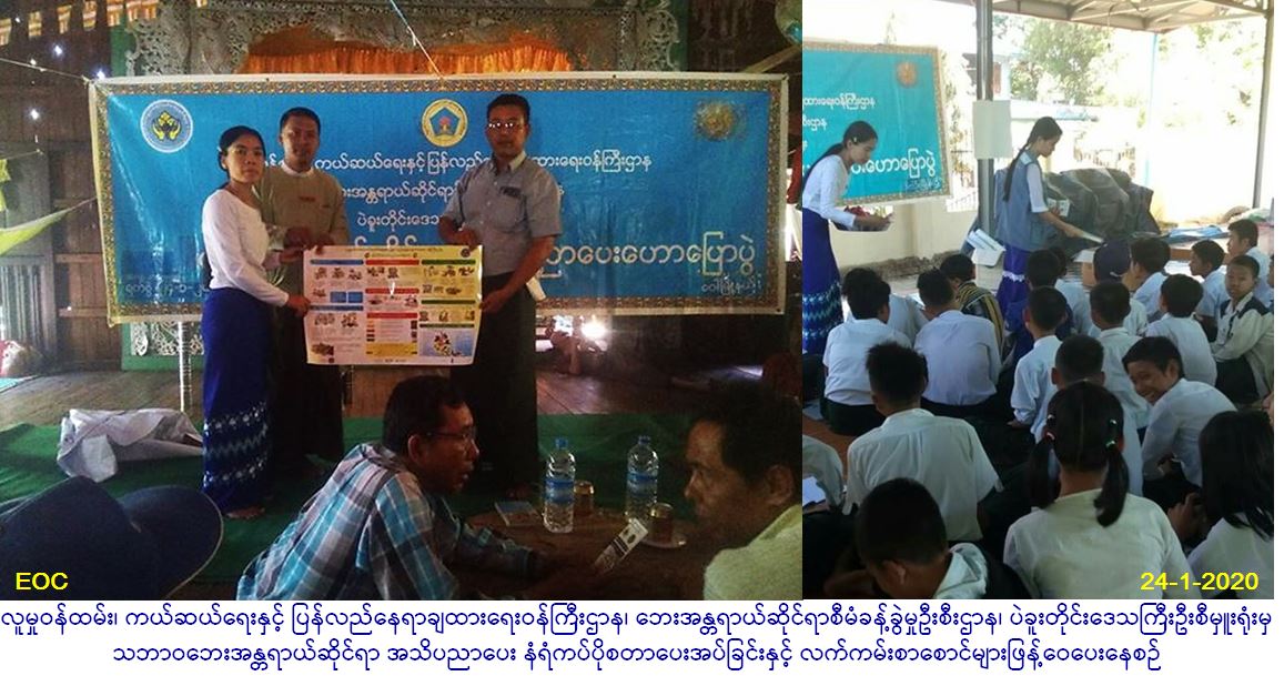 လူမှုဝန်ထမ်း၊ ကယ်ဆယ်ရေးနှင့် ပြန်လည်နေရာချထားရေးဝန်ကြီးဌာန၊ ဘေးအန္တရာယ်ဆိုင်ရာစီမံခန့်ခွဲမှုဦးစီးဌာန၊ ပဲခူးတိုင်းဒေသကြီးဦးစီမှူးရုံးမှ တာဝန်ရှိသူများသည် (၂၄-၁-၂၀၂၀) ရက်နေ့ (၁၁၀၀)နာရီမှ(၁၂း၃၀)နာရီအထိ ဝေါမြို့နယ်၊ ဆင်ရွာကျေးရွာအုပ်စု၊ ဆင်ရွာကျေးရွာ၊ ဘုန်းတော်ကြီးကျောင်းဓမ္မာရုံတွင် ဝေါမြို့နယ့်နယ်အထွေထွေအုပ်ချုပ်ရေးဦးစီးဌာနမှတာဝန်ရှိသူများ၊ ရပ်ကွက်အုပ်ချုပ်ရေးမှူးများနှင့်အတူ ရပ်မိ ရပ်ဖများကျေးရွာအတွင်းရှိပြည်သူများ၊ ကျောင်းသား/ကျောင်းသူများ စုစုပေါင်း (၂၀၀) ဦးကျော်တို့အား ဘေးအန္တရာယ်ဆိုင်ရာ အသိပညာပေး ဆွေးနွေးဟောပြောရာတွင် ဘေးမဖြစ်မီကြိုတင်ပြင်ဆင်ရေး၊ ဘေးဖြစ်စဉ်တုံ့ပြန်ဆောင်ရွက်ရေးနှင့် ဘေးဖြစ်ပြီး ဆောင်ရန်၊ရှောင်ရန်များကို အသိပညာပေးဆွေးနွေးဟောပြောခဲ့ပြီးမီးဘေးဗီနိုင်း(မီးဘေး၊ ရေဘေး၊ လေဘေးနှင့် ငလျင်ဘေးပိုစတာများ)အား ရပ်ကွက်အုပ်ချုပ်ရေးမှူးထံသို့ ပေးအပ်ပြီး လက်ကမ်းစာစောင်များ၊ မုန့့်များဝေငှပေးခဲ့ပါကြောင်း သတင်းရရှိပါသည်။