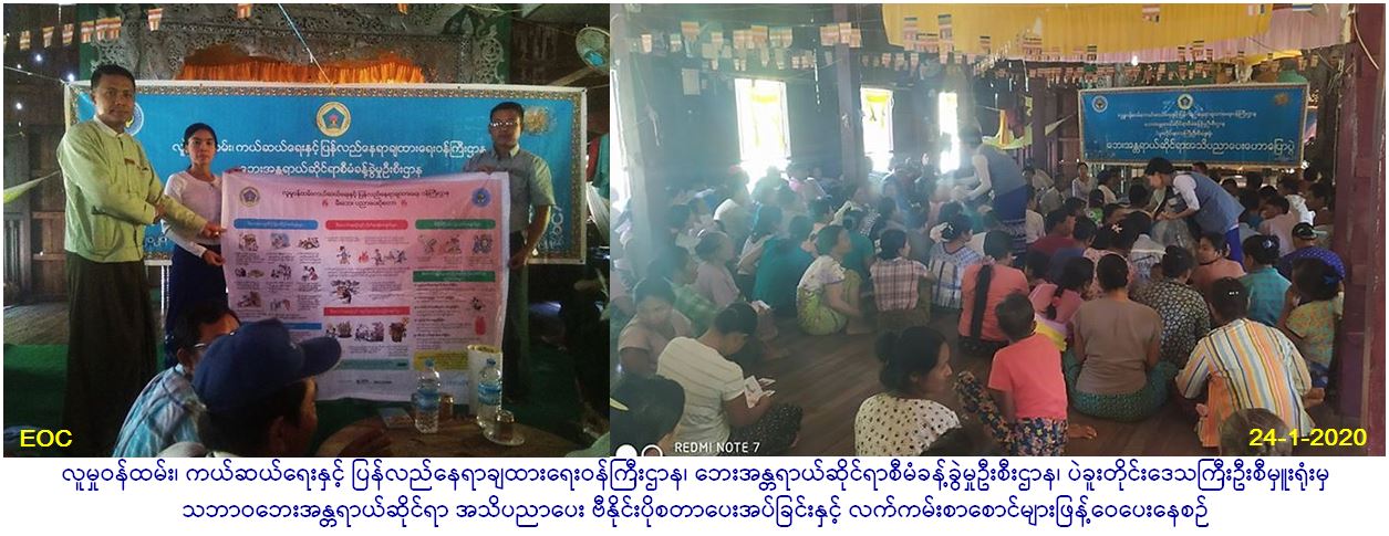 လူမှုဝန်ထမ်း၊ ကယ်ဆယ်ရေးနှင့် ပြန်လည်နေရာချထားရေးဝန်ကြီးဌာန၊ ဘေးအန္တရာယ်ဆိုင်ရာစီမံခန့်ခွဲမှုဦးစီးဌာန၊ ပဲခူးတိုင်းဒေသကြီးဦးစီမှူးရုံးမှ တာဝန်ရှိသူများသည် (၂၄-၁-၂၀၂၀) ရက်နေ့ (၁၄း၀၀)နာရီမှ (၁၅း၃၀) နာရီအထိ ဝေါမြို့နယ်၊ ဝိုင်းပါတ်ကျေးရွာအုပ်စု၊ အထက်ဝိုင်းပါတ် ကျေးရွာ၊ အောက်ဝိုင်းပါတ်ကျေးရွာ၊ကျွန်းစုကျေးရွာအပါ ရွာ (၃) ရွာ၏ အထက်ဝိုင်းပါတ်ဘုန်း တော်ကြီးကျောင်းဓမ္မာရုံတွင် ဝေါမြို့နယ့်နယ် အထွေထွေအုပ်ချုပ်ရေးဦးစီးဌာနမှတာဝန်ရှိသူများ၊ ရပ်ကွက်အုပ်ချုပ်ရေးမှူးများနှင့်အတူ ရပ်မိရပ်ဖများကျေးရွာများအတွင်းရှိ ပြည်သူများ/ စုစုပေါင်း တက်ရောက်လာသူ (၃၀၀) ဦးကျော်တို့အား ဘေးအန္တရာယ်ဆိုင်ရာ အသိပညာပေး ဆွေးနွေးဟောပြောရာတွင် ဘေးမဖြစ်မီကြိုတင် ပြင်ဆင်ရေး၊ ဘေးဖြစ်စဉ်တုံ့ပြန်ဆောင်ရွက်ရေးနှင့် ဘေးဖြစ်ပြီး ဆောင်ရန်၊ရှောင်ရန်များကို အသိပညာပေးဆွေးနွေးဟောပြောခဲ့ပြီး မီးဘေးဗီနိုင်း (မီးဘေး၊ ရေဘေး၊ လေဘေးနှင့် ငလျင်ဘေးပိုစတာများ)အား ရပ်ကွက်အုပ်ချုပ်ရေးမှူးထံသို့ ပေးအပ်ပြီး လက်ကမ်းစာစောင်များ၊ မုန့့်များဝေငှပေး ခဲ့ပါကြောင်း သတင်းရရှိပါသည်။