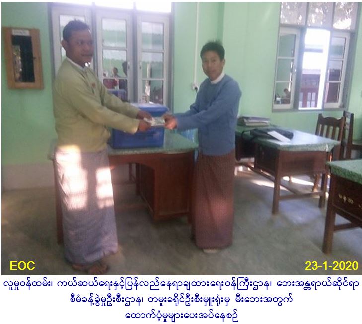 လူမှုဝန်ထမ်း၊ ကယ်ဆယ်ရေးနှင့်ပြန်လည်နေရာချထားရေးဝန်ကြီးဌာန၊ ဘေးအန္တရာယ်ဆိုင်ရာစီမံခန့်ခွဲမှုဦးစီးဌာန၊ တမူးခရိုင်ဦးစီးမှူးရုံးမှ တာဝန်ရှိ သူများသည် (၁၈-၁-၂၀၂၀) ရက်နေ့တွင် တမူးခရိုင်၊ မြို့သစ်မြို့၊ သနန်ကျေးရွာအုပ်စု၊ သနန်ကျေးရွာတွင် မီးလောင်ဆုံးရှုံးခဲ့သည့် နေအိမ်(၁)လုံး ၊ အိမ်ထောင်စု (၁) စုအတွက် ကယ်ဆယ်ရေးပစ္စည်း(၁၇)မျိုး၊ အိမ်ဆောက်ပစ္စည်းဖိုး (၁၀၀,၀၀၀/-) ကျပ်နှင့် ဆန်ရိက္ခာဖိုးထောက်ပံ့ငွေ (၁၂၆၀၀/-) ကျပ်တိတိကို (၂၃-၁-၂၀၂၀)ရက်နေ့ (၁၆:၀၀) နာရီအချိန်တွင် မြို့နယ် ထွေ/အုပ် ဦးစီးဌာနမှ တစ်ဆင့် ထောက်ပံ့ပေးအပ်ခဲ့ပါကြောင်း သတင်း ရရှိပါသည်။