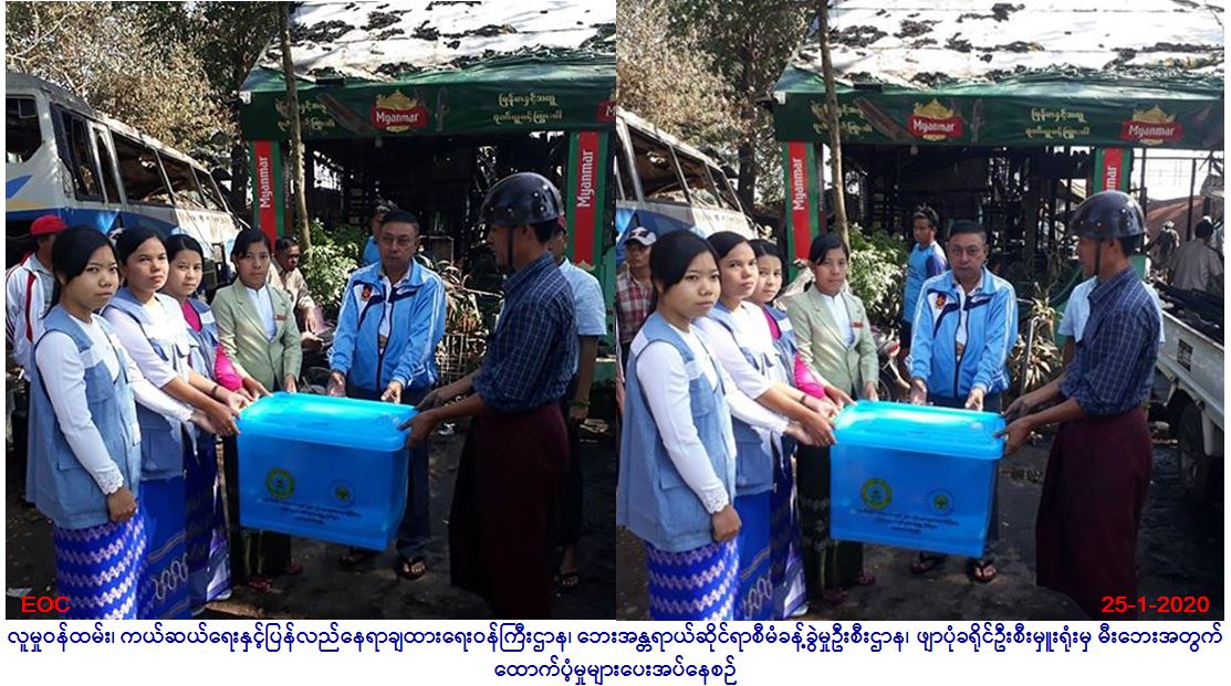 လူမှုဝန်ထမ်း၊ ကယ်ဆယ်ရေးနှင့် ပြန်လည်နေရာချထားရေးဝန်ကြီးဌာန၊ ဘေးအန္တရာယ်ဆိုင်ရာစီမံခန့်ခွဲမှုဦးစီးဌာန၊ ဖျာပုံခရိုင်ဦးစီးမှူးရုံးမှ တာဝန်ရှိသူများသည် ဇန်နဝါရီလ ၂၅ ရက်နေ့တွင် ဖျာပုံမြို့အမှတ် (၁၂) ရပ်ကွက်၊ ဒုတိယလမ်း၌ မီးဘေးဖြစ်ပွားခဲ့ရာ မီးဘေးသင့် အိမ်ခြေတစ်လုံး၊ လူဦးရေ (၂) ဦးတို့အတွက် ကယ်ဆယ်ရေးပစ္စည်း (၁၇)မျိုး (၁)အိမ်ထောင်စာတို့ကို (၂၅.၁.၂၀၂၀)နေ့ နံနက် (၁၀:၃၀)နာရီတွင် ခရိုင်မီးသတ်၊ မြို့နယ်ထွေအုပ်တို့မှတာဝန်ရှိသူများနှင့်အတူ သွားရောက် ထောက်ပံ့ပေးအပ်ခဲ့ပါကြောင်း သတင်းရရှိပါသည်။