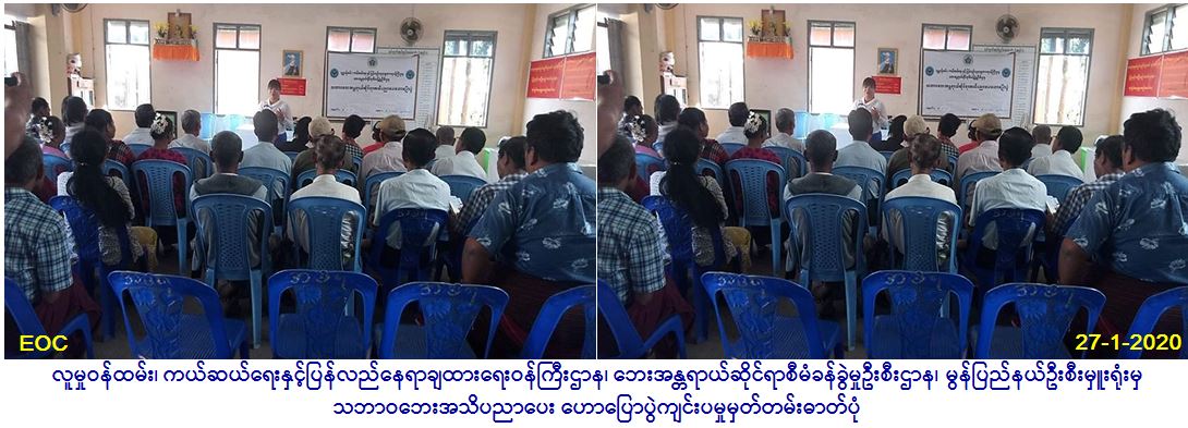 လူမှုဝန်ထမ်း၊ ကယ်ဆယ်ရေးနှင့်ပြန်လည်နေရာချထားရေးဝန်ကြီးဌာန၊ ဘေးအန္တရာယ်ဆိုင်ရာစီမံခန်ခွဲမှုဦးစီးဌာန မွန်ပြည်နယ် ဦးစီးမှူးရုံးမှ တာဝန်ရှိသူများသည် မော်လမြိုင်မြို့၊ ရွှေမြိုင်သီရိရပ်ကွက်၌ (၂၇-၁-၂၀၂၀) ရက်နေ့ (၁၀း၃၀)နာရီ အချိန်မှ (၁၁း၃၀) နာရီအချိန်အထိ သဘာဝဘေးအသိပညာပေး ဟောပြောပွဲ ကျင်းပပြုလုပ်ခဲ့ရာ ရပ်ကွက်နေပြည်သူ (၇၀) ဦးခန့် တက် ရောက်ခဲ့ပြီး သဘာဝဘေးနှင့်စပ်လျဉ်း၍ ဆောင်ရန်၊ ရှောင်ရန်အချက်များ ဆွေးနွေးခြင်း၊ လက်ကမ်းစာစောင်များဖြန့်ဝေခြင်း များဆောင်ရွက်ခဲ့ပါကြောင်း သတင်းရရှိပါသည်။