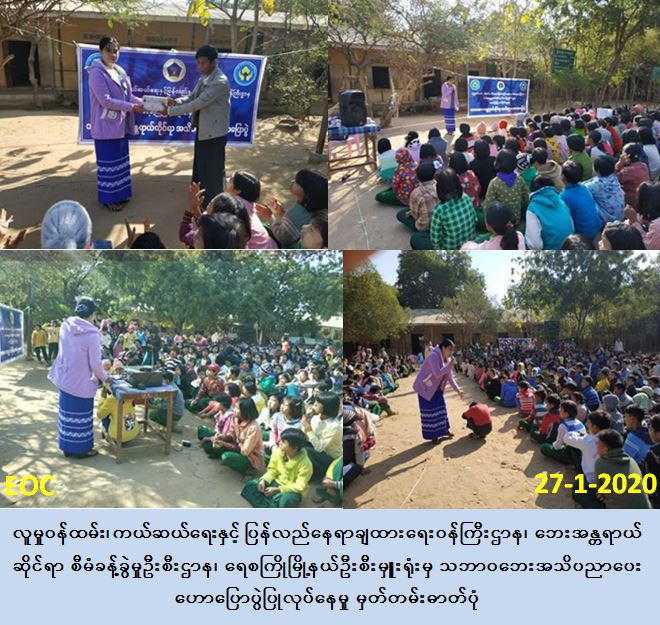 လူမှုဝန်ထမ်း၊ ကယ်ဆယ်ရေးနှင့် ပြန်လည်နေရာချထားရေးဝန်ကြီးဌာန၊ ဘေးအန္တရာယ် ဆိုင်ရာစီမံခန့်ခွဲမှုဦးစီးဌာန၊ ရေစကြိုမြို့နယ်ဦးစီးမှူးရုံးမှ တာဝန်ရှိသူများသည် ( ၂၇ – ၁ -၂၀၂၀ ) ရက်နေ့၊ နံနက် ( ၉ : ၀၀ )နာရီအချိန်မှ ( ၁၀ : ၃၀ ) နာရီအချိန်အထိ ရေစကြိုမြို့နယ်၊ အ. ထ. က(စိတ္တသုခ) ကျောင်း၌ ကျောင်းသား/ သူနှင့် ဆရာ / ဆရာမ (၈၅၀) ဦးတို့အား ငလျင်ဘေး၊ မိုးကြိုးဘေး၊ မုန်တိုင်းဘေး၊ ရေဘေးနှင့်ပတ်သက်၍ ဆောင်ရန်/ ရှောင်ရန် အချက်များအား အသိပညာပေးဆွေးနွေးဟောပြောခြင်း၊ သရုပ်ပြ ခြင်း၊ အမေးအဖြေများအပြန်အလှန်ဆောင်ရွက်ခြင်းနှင့် လက်ကမ်းစာစောင်များပေးအပ် ခဲ့ကြောင်းသတင်းရရှိပါသည်။