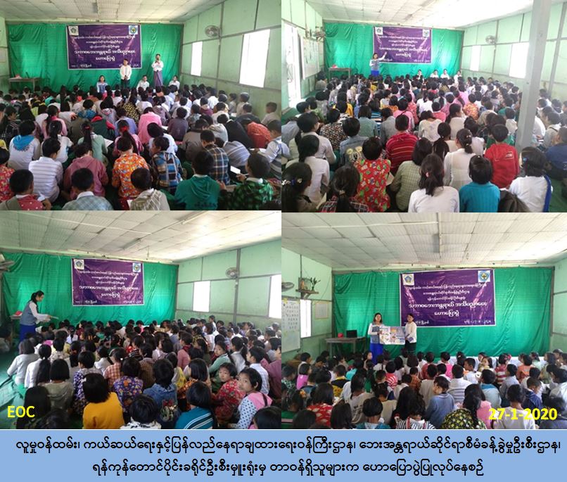 လူမှုဝန်ထမ်း၊ ကယ်ဆယ်ရေးနှင့်လည်နေရာချထားရေးဝန်ကြီးဌာန၊ ဘေးအန္တရာယ်ဆိုင်ရာ စီမံခန့်ခွဲမှုဦးစီးဌာန၊ ရန်ကုန်တောင်ပိုင်ခရိုင်ဦးစီးမှူးရုံးမှ (၂၇-၁-၂၀၂၀ )ရက်နေ့တွင် (၁၁:၀၀) နာရီအချိန်တွင် သုံးခွမြို့နယ်၊ သိုက်တူးကန်စံပြကျေးရွာ၊ အခြေခံပညာအထက် တန်းကျောင်းခွဲတွင် သဘာဝဘေးအန္တရာယ်နှင့် ပတ်သက်သောဆောင်ရန်၊ ရှောင်ရန်များ အား ဆောင်ရွက်နိုင်စေရန်အတွက် ဆရာ၊ ဆရာမ(၂၀) ဦးနှင့် ကျောင်းသူ၊ ကျောင်းသား (၂၀ဝ) ဦး ခန့်အား သဘာဝဘေးအန္တရာယ်နှင့်ပတ်သက်၍ အသိပညာပေးဟောပြောပွဲ ကျင်းပပြုလုပ် ခဲ့ပြီး သဘာဝဘေးအသိပညာပေး လက်ကမ်းစာစောင်များအား ဖြန့်ဝေပေး ခဲ့ပါကြောင်း သတင်းရရှိပါသည်။