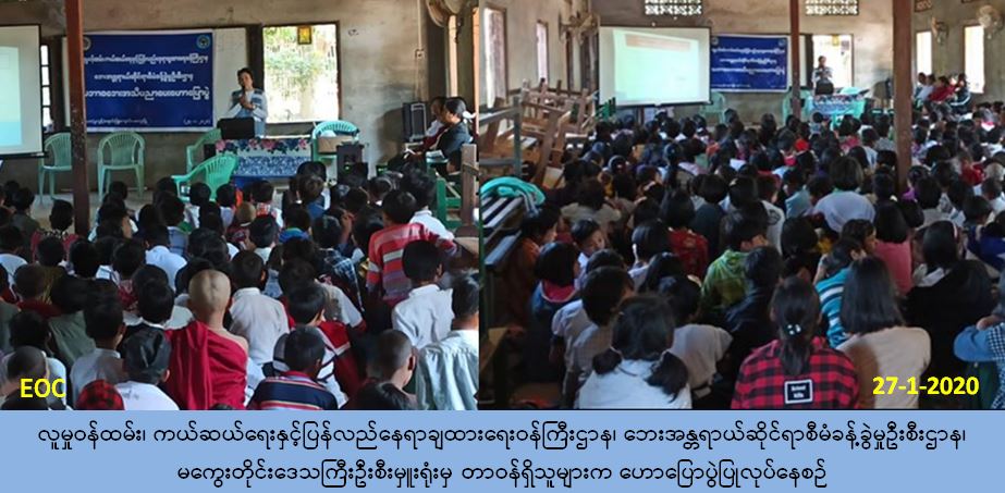 လူမှုဝန်ထမ်း၊ ကယ်ဆယ်ရေးနှင့်ပြန်လည်နေရာချထားရေးဝန်ကြီးဌာန၊ ဘေးအန္တရာယ် ဆိုင်ရာစီမံခန့်ခွဲမှုဦးစီးဌာန၊ မကွေးတိုင်းဒေသကြီးဦးစီးမှူးရုံးမှ တာဝန်ရှိသူများသည် (၂၇-၁-၂၀၂၀) ရက်နေ့၊ မွန်းလွဲ (၀၁:၀၀) နာရီမှ (၂:၃၀) နာရီထိ မကွေးမြို့နယ်၊ အ.လ.က(ခွဲ) ချောင်းဖြူ အခြေခံပညာအလယ်တန်းကျောင်း (ခွဲ) တွင် ဆရာ၊ ဆရာမ၊ ကျောင်းသား၊ ကျောင်းသူ တက်ရောက်သူ စုစုပေါင်း (၃၀၀) ဦးခန့်အား ငလျင်ဘေး၊ မီးဘေးနှင့် အခြားသဘာဝဘေးများအကြောင်း အသိပညာပေးဟောပြောဆွေးနွေးပွဲကို ကျင်းပပြုလုပ် ခဲ့ပြီး အဆိုပါ ဟောပြောပွဲတွင် ဦးစီးဌာန၏ လုပ်ငန်းတာဝန်များ၊ ရည်ရွယ်ချက်များ၊ ဘေး(၈) မျိုးဖြစ်ပွားပါက ဆောင်ရန်၊ ရှောင်ရန်များကို ကျောင်းသား၊ ကျောင်းသူများအား အသိပညာများရရှိစေရန်အတွက် ဟောပြောခဲ့ပြီး လက်ကမ်းစာစောင်များနှင့် စာရေး ကိရိယာများဝေငှခဲ့ပါကြောင်း သတင်းရရှိပါသည်။