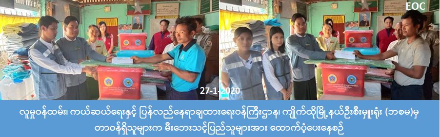 လူမှုဝန်ထမ်း၊ ကယ်ဆယ်ရေးနှင့်ပြန်လည်နေရာချထားရေးဝန်ကြီးဌာန၊ ဘေးအန္တရာယ်ဆိုင်ရာစီမံခန့်ခွဲမှု ဦးစီးဌာန၊ မွန်ပြည်နယ်၊ သထုံခရိုင်၊ ကျိုက်ထိုမြို့နယ်ဦးစီးမှူးရုံးမှ တာဝန်ရှိသူများသည် ကျိုက်ထိုမြို့နယ်၊ ဇေယျာမွန်ရပ်ကွက်၊ ဂေါက်ကွင်းကျူးကျော်ပိုင်း၌ (၂၅-၁-၂၀၂၀)ရက်နေ့တွင် ဖြစ်ပွားခဲ့သော မီးလောင် ကျွမ်းမှုကြောင့် ဘေးသင့်ပျက်စီးနေအိမ် (၆)လုံးအတွက် ကယ်ဆယ်ရေးပစ္စည်း (၁၇)မျိုး (၆)အိမ်ထောင်စာနှင့် စက္ကူပုံး (၆)ပုံးအားလည်းကောင်း၊ အဆိုပါနေအိမ်များမှ လူဦးရေ (၂၆)ဦးအတွက် (၇)ရက်စာဆန်ရိက္ခာဖိုးငွေ (၅၄,၆၀ဝ) ကျပ်အားလည်းကောင်း၊ စုစုပေါင်းထောက်ပံ့ငွေ (၅၄,၆၀ဝ) ကျပ်တို့အား (၂၇-၁-၂၀၂၀)ရက်နေ့၊ (၁၄:၀၀)အချိန်တွင် ဇေယျာမွန်ရပ်ကွက်၊ အုပ်ချုပ်ရေးမှူးရုံး၌ မြို့နယ်သဘာဝဘေးကော်မတီအဖွဲ့ဝင်များနှင့်အတူ ဘေးသင့်ပြည်သူများအားထောက်ပံ့ပေးအပ်ခဲ့ကြောင်း သိရှိရပါသည်။