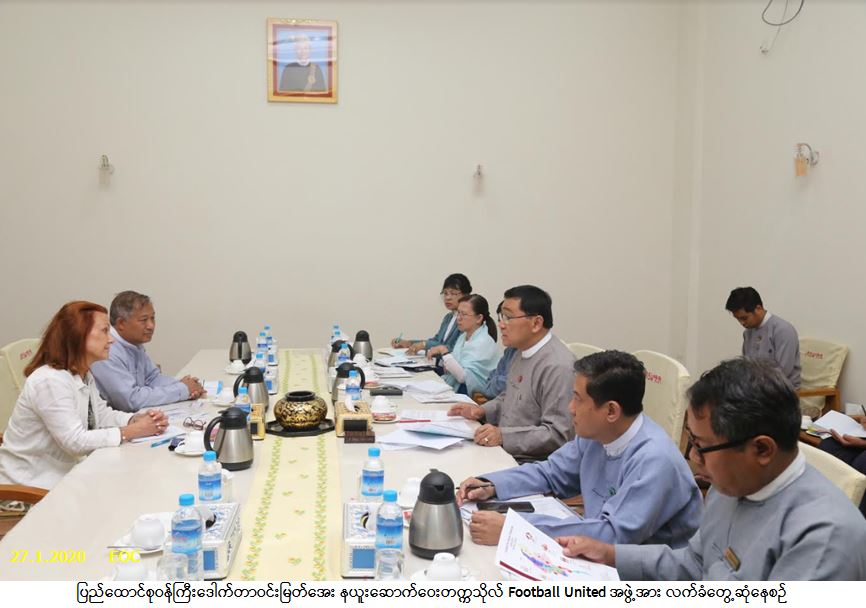 ထိုသို့တွေ့ဆုံရာတွင် ဝန်ကြီးဌာနအနေဖြင့် ပြည်သူအားလုံး၏ လူမှုစီးပွားဘဝ မြင့်မားတိုးတက် လာစေရေးနှင့် ဘေးအန္တရာယ်များကို ကြံ့ကြံ့ခိုင် ရင်ဆိုင်တုံ့ပြန်နိုင်စွမ်းရှိသော လူ့အသိုက်အဝန်းတစ်ရပ် ဖြစ်ပေါ်လာစေရေး ဆောင်ရွက်လျက်ရှိကြောင်း၊ ထိုသို့ဆောင်ရွက်နေရာတွင် သဘာဝဘေး အန္တရာယ်များ သာမက ပဋိပက္ခများကဲ့သို့ လူ့ကြောင့်ဖြစ်သော ဘေးအန္တရာယ်ဆိုင်ရာကိစ္စရပ်များကိုလည်း တာဝန်ယူ ဆောင်ရွက်ရသည့်အတွက် လူမှုသဟဇာတမျှတရေးနှင့် ယုံကြည်မှု တည်ဆောက်ရေးလုပ်ငန်းများမှာ စဉ်ဆက်မပြတ်ဆောင်ရွက်လျက်ရှိသည့် လုပ်ငန်းများဖြစ်ကြောင်း၊ ထို့အပြင် မူးယစ်ဆေးဖြတ်ပြီးသူများ ပြန်လည်ထူထောင်ရေး၊ ပြစ်ဒဏ်ကျခံရသော အသက်(၁၈)နှစ်အောက် ကလေးသူငယ်များအား မိမိတို့ဝန်ကြီးဌာန အောက်ရှိ လူငယ်သင်တန်းကျောင်းများတွင် ပြန်လည်ထူထောင်ရေး ဆောင်ရွက်ပေးလျက်ရှိရာ အဆိုပါ လူငယ်များအနေဖြင့်လည်း လူ့အသိုက်အဝန်းသို့ ပြန်လည်ဝင်ဆံ့ပေါင်းစည်းရေးလုပ်ငန်းများ ဆောင်ရွက်ပေး နေကြောင်း၊ ဤ Football United အဖွဲ့က ဆောင်ရွက်လျက်ရှိသော ဘောလုံးကစားနည်းသည် နားလည်ယုံကြည်မှုဖြင့် အပေးအယူမျှတစွာ ပူးပေါင်းဆောင်ရွက်နိုင်စေခြင်း၊ လူငယ်များအကြား လူမှုသဟဇာတ မျှတရေး အသိအမြင်များ ကိန်းအောင်းစေခြင်း၊ အခက်အခဲတစ်ခုကြုံတွေ့လျှင် အားလုံးပူးပေါင်းဖြေရှင်း ဆောင်ရွက်တတ်ခြင်း၊ အသင်းအဖွဲ့နှင့်ဆောင်ရွက်တတ်လာစေခြင်းစသော အကျိုးကျေးဇူးများ ရရှိနိုင်သည့် အားကစားနှင့် အသိပညာပေး ရောယှက်ဆောင်ရွက်နိုင်သည့် စီမံချက်ဖြစ်၍ အဆိုပါစီမံချက်အား တိုးချဲ့ဆောင်ရွက်နိုင်ရန်ကိစ္စနှင့်စပ်လျဉ်း၍ တွေ့ဆုံဆွေးနွေးခဲ့ကြောင်း သတင်းရရှိပါသည်။