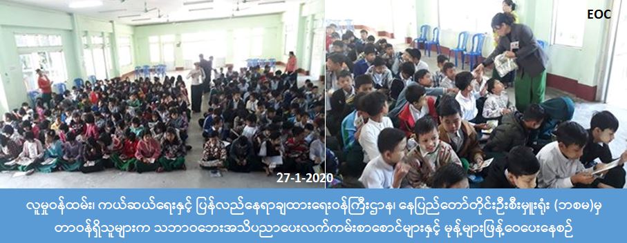 လူမှုဝန်ထမ်း၊ ကယ်ဆယ်ရေးနှင့် ပြန်လည်နေရာချထားရေးဝန်ကြီးဌာန၊ ဘေးအန္တရာယ်ဆိုင်ရာ စီမံခန့်ခွဲမှုဉီးစီး ဌာန၊ နေပြည်တော်တိုင်း ဉီးစီးမှူးနှင့် တာဝန်ရှိသူများသည် (၂၇.၁.၂၀၂၀) ရက်နေ့၊ (၀၉:၃၀)ချိန်မှ (၁၁:၄၅) ချိန် အထိ ဇဗ္ဗူသီရိမြို့နယ်၊ အ.ထ.က (၁၀)ကျောင်းတွင် ကျောင်းသား/ သူများအား သဘာဝဘေးအန္တရာယ် များနှင့်ပတ်သက်သော ဆောင်ရန်/ ရှောင်ရန် အချက်များအား သိရှိလိုက်နာဆောင်ရွက်နိုင် ရေးအတွက် သဘာဝ ဘေးအသိပညာပေး ဟောပြောပွဲနှင့် ငလျင်ဘေးဖြစ်ပွားလာပါက ဖြစ်ပွားနေစဉ် မည်ကဲ့သို့ပြုမူနေထိုင်ရမည်ကို ကျောင်းသား/သူ (၃၀၀)ဉီးအား အသိပညာပေးဟောပြောခဲ့ပြီး တက်ရောက်လာသူများအား သဘာဝဘေးအသိ ပညာပေး လက်ကမ်းစာစောင်များ၊ ဗီနိုင်းပိုစတာ၊ နံရံကပ်ပိုစတာများနှင့် မုန့်များဖြန့်ဝေပေးခဲ့ကြောင်း သိရှိရပါသည်။