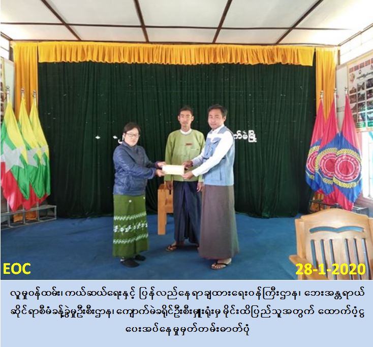 လူမှုဝန်ထမ်း၊ ကယ်ဆယ်ရေးနှင့် ပြန်လည်နေရာချထားရေးဝန်ကြီးဌာန၊ ဘေးအန္တရာယ် ဆိုင်ရာစီမံခန့်ခွဲမှုဦးစီးဌာန၊ ကျောက်မဲခရိုင်ဦးစီးမှူးရုံးမှ တာဝန်ရှိသူများသည် ( ၂၃ – ၁-၂၀၂၀ ) ရက်နေ့တွင် ကျောက်မဲမြို့နယ်၊ မန်ခေါက်ကျေးရွာအုပ်စု၊ အာပြောင်ကျေးရွာ အနီးတွင် မိုင်းနင်းမိ၍ ဒဏ်ရာရရှိသူ (၁) ဦးအတွက် ထောက်ပံ့ငွေ (၅၀,၀၀ဝိ/-) ကျပ်အား ( ၂၈ – ၁-၂၀၂၀ ) ရက်နေ့ ( ၁၂ : ၃၀ ) နာရီအချိန်တွင် ကျောက်မဲမြို့နယ်အထွေထွေ အုပ်ချုပ်ရေးဦးစီးဌာနမှ တာဝန်ရှိသူများနှင့်အတူ ထောက်ပံ့ခဲ့ကြောင်းသတင်းရရှိပါသည်။