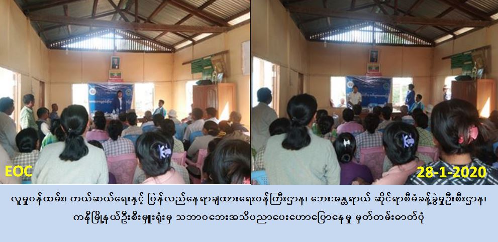 လူမှုဝန်ထမ်း၊ ကယ်ဆယ်ရေးနှင့် ပြန်လည်နေရာချထားရေးဝန်ကြီးဌာန၊ ဘေးအန္တရာယ် ဆိုင်ရာစီမံခန့်ခွဲမှုဦးစီးဌာန၊ ကနီမြို့နယ်ဦးစီးမှူးရုံးမှ တာဝန်ရှိသူများသည် (၂၈- ၁- ၂၀၂၀) ရက်နေ့တွင် ( ၁၃ : ၀၀ ) နာရီအချိန်မှ ( ၁၄ : ၃၀ )နာရီအချိန်ထိ ကနီမြို့နယ် ၊ တဇယ်ချောင် ကျေးရွာအုပ်စု၊ တဇယ်ချောင်ကျေးရွာရှိ ကျေးရွာအုပ်စု၊ အုပ်ချုပ်ရေးမှူးရုံးအတွင်း ကျေး ရွာသူ၊ ကျေးရွာသား (၇၀) ဦးခန့်အား ဦးစီးဌာန၏လုပ်ငန်းတာဝန်များ ၊ ရည်ရွယ်ချက်များ၊ ထောက်ပံ့နှုန်းထားများနှင့် ငလျင်ဘေးနှင့် အခြားသဘာဝဘေးအန္တရာယ်ဆိုင်ရာ အသိ ပညာများအား ဟောပြောဆွေးနွေးခဲ့ပြီး တက်ရောက်လာသူများအား အသိပညာပေးလက် ကမ်းစာစောင်နှင့် ငလျင်ဘေးအသိပညာပေးနံရံကပ်ပိုစတာများ ဖြန့်ဝေပေးအပ်ခဲ့ကြောင်း သတင်းရရှိပါသည်။