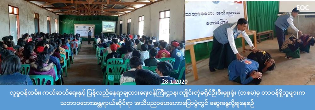 လူမှုဝန်ထမ်း၊ ကယ်ဆယ်ရေးနှင့်ပြန်လည်နေရာချထားရေးဝန်ကြီးဌာန၊ ဘေးအန္တရာယ်ဆိုင်ရာ စီမံခန့်ခွဲမှုဦးစီးဌာန၊ ကျိုင်းတုံခရိုင်ဦးစီးမှူးရုံးမှ တာဝန်ရှိသူများသည် (၂၈-၁-၂၀၂၀) ရက်နေ့၊ နံနက် (၉:၀၀) နာရီ မှ (၁၁:၀၀) နာရီ ထိ ကျိုင်းတုံခရိုင်၊ ကျိုင်းတုံမြို့နယ် လွယ်မွေ အ.ထ.က ကျောင်းတွင် ဆရာ/ဆရာမများ၊ကျောင်းသူ /ကျောင်းသားများ (၃၅၀) ဦးကို သဘာဝဘေးအန္တရာယ်များနှင့်ပတ်သက်သော ဆောင်ရန်/ ရှောင်ရန်အချက်များ အား သိရှိလိုက်နာဆောင်ရွက်နိုင်ရေးအတွက် သဘာဝဘေးအန္တရာယ်ဆိုင်ရာအသိပညာပေး ဟောပြောပွဲကို ကျင်းပပြုလုပ်ခဲ့ပါသည်။ အဆိုပါ ဟောပြောပွဲသို့ တက်ရောက်လာသူများအား သဘာဝဘေးအသိပညာပေးလက်ကမ်း စာစောင်များ ဖြန့်ဝေပေးခဲ့ ကြောင်း သိရှိရပါသည်။