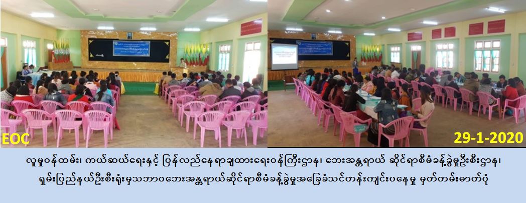 လူမှုဝန်ထမ်း၊ ကယ်ဆယ်ရေးနှင့် ပြန်လည်နေရာချထားရေးဝန်ကြီးဌာန၊ ဘေးအန္တရာယ် ဆိုင်ရာစီမံခန့်ခွဲမှုဦးစီးဌာန၊ ရှမ်းပြည်နယ်ဦးစီးရုံးမှ တာဝန်ရှိသူများသည်( ၂၈ – ၁ – ၂၀၂၀) ရက်နေ့၊ နံနက်( ၉ : ၀၀) အချိန်မှ ညနေ ( ၁၆ : ၃၀ ) အချိန်ထိ ရှမ်းပြည်နယ်တောင်ပိုင်း ဓနုကိုယ်ပိုင်အုပ်ချုပ်ခွင့်ရဒေသ၊ ပင်းတယမြို့နယ်၊ အထွေထွေအုပ်ချုပ်ရေးဦးစီးဌာန ၊ အစည်အဝေးခန်းမတွင် သင်တန်းသား (၅၁) ဦးအား သဘာဝဘေးအန္တရာယ်ဆိုင်ရာစီမံ ခန့်ခွဲမှု အခြေခံသင်တန်းအား ပြုလုပ်ကျင်းပခဲ့ပြီး သင်တန်းသား / သူများမှ အပြန်အလှန် ဆွေးနွေးခြင်းများ ပြုလုပ်ခဲ့ပါကြောင်းနှင့် အဆိုပါသင်တန်းအား (၂၉ -၁- ၂၀၂၀ ) ရက်နေ့ မှ (၁- ၂- ၂၀၂၀ ) ရက်နေ့အထိ ဆက်လက်ကျင်းပရန် စီစဉ်ဆောင်ရွက်လျက်ရှိပါ ကြောင်း သတင်းရရှိပါသည်။