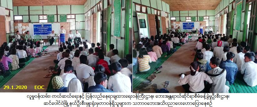 လူမှုဝန်ထမ်း၊ ကယ်ဆယ်ရေးနှင့် ပြန်လည်နေရာချထားရေးဝန်ကြီးဌာန၊ ဘေးအန္တရာယ်ဆိုင်ရာစီမံခန့်ခွဲမှုဦးစီး ဌာန၊ ဆင်ပေါင်ဝဲမြို့နယ်ဦးစီးမှူးရုံးမှတာဝန်ရှိသူများသည် (၂၉-၁-၂၀၂၀) ရက်နေ့၊ (၁၀:၃၀)အချိန်တွင် ဆင်ပေါင်ဝဲမြို့နယ်၊ အင်းမကျေးရွာအုပ်စု၊ အလယ်ရွာကျေးရွာအခြေခံပညာအထက်တန်းကျောင်း(ခွဲ)၌ ဆရာ/ဆရာမနှင့် ကျောင်းသား/ကျောင်းသူစုစုပေါင်း (၁၆၀)ဦးခန့်ကို သဘာဝဘေးအန္တရာယ်များနှင့် စပ်လျဉ်း၍အသိပညာပေးဟောပြောခဲ့ပြီး တက်ရောက်လာသူများအား လက်ကမ်းစာစောင်များနှင့် စာရေးကိရိယာများဖြန့်ဝေပေးခဲ့ပါကြောင်း သတင်းရရှိပါသည်။