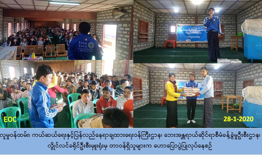 လူမှုဝန်ထမ်း၊ ကယ်ဆယ်ရေးနှင့်ပြန်လည်နေရာချထားရေး၀န်ကြီးဌာန၊ ဘေးအန္တရာယ် ဆိုင်ရာစီမံခန့်ခွဲမှုဦးစီးဌာန၊ လွိုင်လင်ခရိုင်ဦးစီးမှူးရုံး တာဝန်ရှိသူများသည် (၂၉-၁-၂၀၂၀) ရက်နေ့ နံနက် (၉:၀၀) နာရီမှ (၁၁:၀၀) နာရီ အချိန်ထိ အ.ထ.က (၂)၊ ပင်လုံမြို့တွင် ကျောင်းသား၊ ကျောင်းသူ (၂၅၀) ဦးခန့်အား ငလျင်ဘေး၊ မီးဘေး၊ မြေပြိုဘေး နှင့် အခြားဘေးန္တရာယ်များကို အသိပညာပေး ဟောပြော၍ သရုပ်ပြသခြင်းနှင့် လက်ကမ်းစာ စောင်များဝေငှပြီး ဗလာစာအုပ်များ ပေးအပ်လှူဒါန်းခဲ့ပါကြောင်းသတင်းရရှိပါသည်။