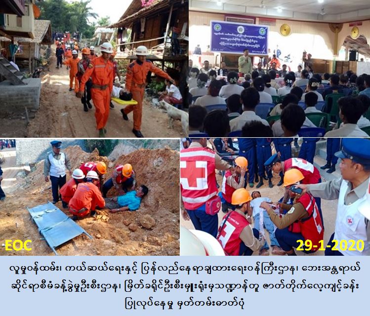 လူမှုဝန်ထမ်း၊ ကယ်ဆယ်ရေးနှင့် ပြန်လည်နေရာချထားရေးဝန်ကြီးဌာန၊ ဘေးအန္တရာယ် ဆိုင်ရာစီမံခန့်ခွဲမှုဦးစီးဌာန၊ မြိတ်ခရိုင်ဦးစီးမှူးရုံးမှ တာဝန်ရှိသူများသည်( ၂၉ – ၁ – ၂၀၂၀ ) ရက်နေ့ ၊ နံနက်( ၉: ၀၀ ) အချိန်တွင် မြိတ်မြို့နယ်၊ မြိတ်တောင်ရပ်ကွက်၊ ဘုရားကိုင်ရပ်၊ အောင်မြေသုခ ဘုန်းတော်ကြီးကျောင်းတွင် မြေပြိုဘေး သဏ္ဍာန်တူဇာတ်တိုက်လေ့ကျင့် ခြင်းကို မြို့နယ်သဘာဝဘေးကော်မတီ၊ မီးသတ်ဦးစီးဌာန၊ ကြက်ခြေနီတပ်ဖွဲ့၊ အရန်မီး သတ်တပ်ဖွဲ့၊ အရေးပေါ်လူနာတင်ယာဉ်အဖွဲ့၊ ရပ်ကွက်အုပ်ချုပ်းရေးမှူးနှင့် ရာအိမ်မှူးများ၊ ကျန်းမာရေးဦးစီးဌာန၊ ရပ်ကွက်နေပြည်သူများ၊ ကျောင်းသား၊ ကျောင်းသူများ စုစုပေါင်း (၂၀၀) ဦးပါဝင်လျက် သွားရောက်ဆောင်ရွက်ခဲ့ကြောင်း သတင်းရရှိပါသည်။