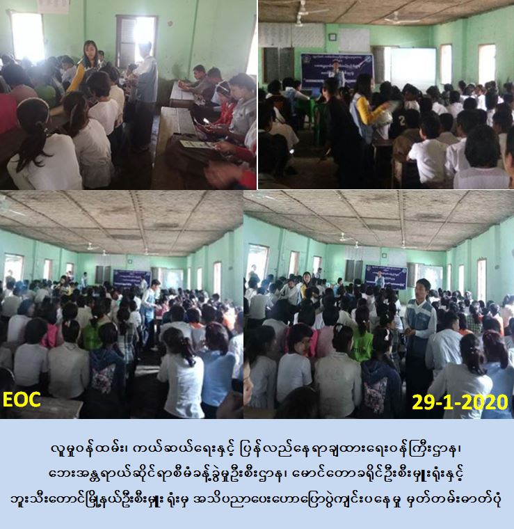 လူမှု၀န်ထမ်း၊ ကယ်ဆယ်ရေးနှင့် ပြန်လည်နေရာချထားရေး၀န်ကြီးဌာန၊ ဘေးအန္တရာယ် ဆိုင်ရာစီမံခန့်ခွဲမှုဦးစီးဌာန၊ မောင်တောခရိုင်ဦးစီးမှူးရုံးနှင့် ဘူးသီးတောင်မြို့နယ်ဦးစီးမှူး ရုံးမှ တာဝန်ရှိသူများသည် ( ၂၉ – ၁ -၂၀၂၀ ) ရက်နေ့၊ ( ၁၂ : ၃၀ ) နာရီအချိန်မှ ( ၁၃ : ၄၀ ) နာရီအချိန်အထိ ဘူးသီးတောင်မြို့၊ မြို့မ (၂) ရပ်ကွက်အခြေခံပညာအထက်တန်းကျောင်း ၊ အ.ထ.က (ခွဲ)၊ အ.လ.က(၃) ကျောင်းတွင် ဆရာ/ ဆရာမများနှင့် ကျောင်းသား/ ကျောင်းသူ (၂၀၀) ဦးအား သဘာဝဘေးအန္တရာယ်များနှင့်ပတ်သက်သော ဆောင်ရန်၊ ရှောင်ရန် အ ချက်များအား သိရှိလိုက်နာဆောင်ရွက်နိုင်ရေးနှင့် ဘေးဖြစ်ပွားလာပါက ဖြစ်ပွားနေစဉ် မည်ကဲ့သို့ပြုမူနေထိုင်ရမည်ဖြစ်ကြောင်းကို သဘာဝဘေးအသိပညာပေးဟောပြောခဲ့ပြီး တက်ရောက်လာသူများအား သဘာဝဘေးအသိပညာပေး လက်ကမ်းစာစောင်များနှင့် ဗ လာစာအုပ်များဖြန့် ဝေပေးခဲ့ပါကြောင်းသတင်းရရှိပါသည်။