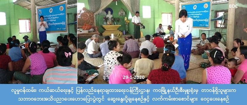လူမှုဝန်ထမ်း၊ ကယ်ဆယ်ရေးနှင့် ပြန်လည်နေရာချထားရေးဝန်ကြီးဌာန၊ ဘေးအန္တရာယ်ဆိုင်ရာ စီမံခန့်ခွဲမှုဦးစီး ဌာန၊ ပဲခူးတိုင်းဒေသကြီး၊ ကဝမြို့နယ်ဦးစီးမှူးရုံးမှတာဝန်ရှိသူများသည် (၂၉-၁-၂၀၂၀) ရက်နေ့ (၁၃:၀၀) နာရီ မှ(၁၄:၃၀)နာရီအထိ ပဲခူးခရိုင်၊ ကဝမြို့နယ်၊နဘဲပင်ကျေးရွာ၊ နဘဲပင်ဘုန်းတော်ကြီးကျောင်းဓမ္မာရုံတွင် နဘဲပင် ကျေးရွာအုပ်ချုပ်ရေးမှူးနှင့်အတူ ရပ်မိရပ်ဖများကျေးရွာများအတွင်းရှိ ပြည်သူများ/ စုစုပေါင်း တက်ရောက်လာ သူ(၁၅၀)ဦးခန့်အား ဘေးအန္တရာယ်ဆိုင်ရာ အသိပညာပေး ဆွေးနွေးဟောပြောခဲ့ပြီး ဘေးမဖြစ်မီ ကြိုတင် ပြင်ဆင်ရေး၊ ဘေးဖြစ်စဉ်တုံ့ပြန်ဆောင်ရွက်ရေးနှင့် ဘေးဖြစ်ပြီး ဆောင်ရန်၊ရှောင်ရန်များကို အသိပညာပေး ဆွေးနွေးဟောပြောခဲ့ပြီး မီးဘေးဗီနိုင်း၊(မီးဘေး၊ရေဘေး၊လေဘေးနှင့် ငလျင်ဘေးပိုစတာများ) အား ရပ်ကွက် အုပ်ချုပ်ရေးမှူးသို့ ပေးအပ်ခဲ့ပြီး တက်ရောက်လာသူများအား လက်ကမ်းစာစောင်များ၊ မုန့်များဝေငှပေးခဲ့ ကြောင်း သိရှိရပါသည်။