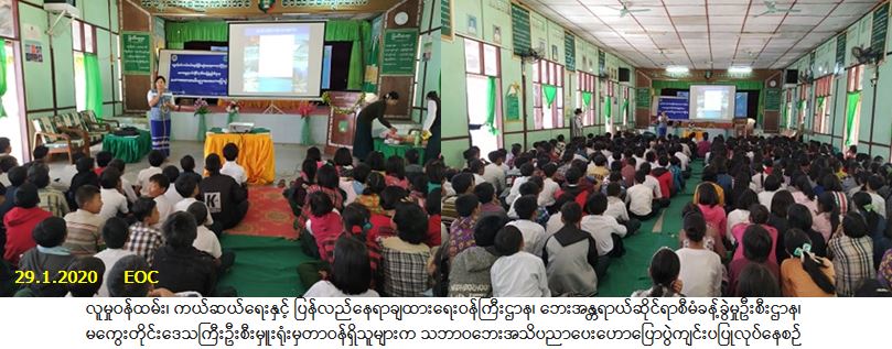 လူမှုဝန်ထမ်း၊ ကယ်ဆယ်ရေးနှင့် ပြန်လည်နေရာချထားရေးဝန်ကြီးဌာန၊ ဘေးအန္တရာယ်ဆိုင်ရာစီမံခန့်ခွဲမှုဦးစီး ဌာန၊ မကွေးတိုင်းဒေသကြီးဦးစီးမှူးရုံးမှတာဝန်ရှိသူများသည် (၂၉-၁-၂၀၂၀) ရက်နေ့၊ (၁၃:၀၀) နာရီအချိန်တွင် မကွေးမြို့၊ အ.ထ.က (၂) ကျောင်း၌ ဆရာ/ဆရာမများနှင့် ကျောင်းသား/ကျောင်းသူ (၄၀၀) ဦးခန့်ကို သဘာဝဘေးစီမံခန့်ခွဲမှုလုပ်ငန်းစဉ်များအကြောင်းဟောပြောခြင်း၊ သဘာဝဘေးနှင့်စပ်လျဉ်း၍ ဆောင်ရန်/ ရှောင်ရန်အချက်များဟောပြောခြင်းတို့ဆောင်ရွက်ခဲ့ပြီး တက်ရောက်လာသူများအား သဘာဝဘေး လက်ကမ်းစာစောင်များ ဖြန့်ဝေပေးခဲ့ပါကြောင်း သတင်းရရှိပါသည်။