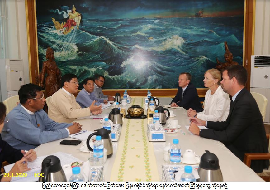 ထို့သို့တွေ့ဆုံရာတွင် ပြည်တွင်းနေရပ်စွန့်ခွာသူများ ပြန်လည်နေရာချထားရေးနှင့် ယာယီခိုလှုံရာစခန်း များပိတ်သိမ်းရေးဆိုင်ရာ အမျိုးသားအဆင့်မဟာဗျူဟာကို အတည်ပြုပြဌာန်းခဲ့ ပြီးနောက် အဆိုပါမဟာဗျူဟာ အား အကောင်အထည်ဖော်ရန်လက်ရှိ ဆောင်ရွက်နေသည့် အခြေအနေများ၊ ပြန်လည်နေရာချထားရေး ဆောင်ရွက်ရာတွင် အဓိကအရေးပါသည့် လုံခြုံရေး၊ ဘေးအန္တရာယ်ကင်းရှင်းရေးနှင့် ရေရှည်ဘဝရပ်တည်မှု အတွက် အသက်မွေးဝမ်းကျောင်းလုပ်ငန်းများ ပြန်လည်ဆောင်ရွက်နိုင်ရေးအတွက် မိုင်းအန္တရာယ်ရှိသည့် နေရာများတွင် လူသားချင်း စာနာထောက်ထားမှုကို ရှေးရှုသည့် မိုင်းရှင်းလင်းရေးလုပ်ငန်းစဉ်များကို သက်ဆိုင်ရာဝန်ကြီးဌာနများ၊ တိုင်းဒေသကြီး/ပြည်နယ်များနှင့် ညှိနှိုင်းဆောင်ရွက်လျက်ရှိသည့် ကိစ္စရပ်များ၊ မိုင်းအန္တရာယ်ဆိုင်ရာ ကိစ္စရပ်များနှင့်စပ်လျဉ်း၍ ကြီးကြပ်ကွပ်ကဲပေးနိုင်မည့် မိုင်းအန္တရာယ်ဆိုင်ရာ အဖွဲ့အစည်း တစ်ရပ် ပေါ်ပေါက်လာရေး လက်ရှိဆောင်ရွက်နေမှုများနှင့် အပြည်ပြည်ဆိုင်ရာ မိုင်းကင်းစင်ရေးစာချုပ်၏ လက်ရှိဥက္ကဌဖြစ်သူ နော်ဝေနိုင်ငံအနေဖြင့် ပူးပေါင်းဆောင်ရွက်နိုင်မည့်အခြေအနေများနှင့်စပ်လျဉ်း၍ တွေ့ဆုံ ဆွေးနွေးခဲ့ကြကြောင်း သတင်းရရှိပါသည်။