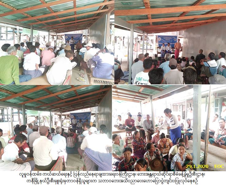 လူမှုဝန်ထမ်း၊ ကယ်ဆယ်ရေးနှင့် ပြန်လည်နေရာချထားရေးဝန်ကြီးဌာန၊ ဘေးအန္တရာယ်ဆိုင်ရာစီမံခန့်ခွဲမှုဦးစီး ဌာန၊ ကနီမြို့နယ်ဦးစီးမှူးရုံးမှတာဝန်ရှိသူများနှင့် တိုင်းဒေသကြီးလွှတ်တော်ကိုယ်စားလှယ်တို့သည် (၂၉-၁-၂၀၂၀)ရက်နေ့၊ (၁၃:၀၀)နာရီအချိန်မှ (၁၅:၃၀)နာရီအချိန်အထိ စစ်ကိုင်းတိုင်းဒေသကြီး၊ ကနီမြို့နယ်၊ ဘုတ်ကုန်းကျေးရွာအုပ်စု၊ ကံတောကျေးရွာ၌ ကျေးရွာသူ/သား (၆၀)ဦးခန့်ကို ဦးစီးဌာန၏ လုပ်ငန်းတာဝန်များ၊ ရည်ရွယ်ချက်များ၊ ထောက်ပံ့မှုနှုန်းထားများအားရှင်းလင်းခြင်း၊ ငလျင်ဘေးနှင့် အခြားသောသဘာဝ ဘေးအန္တရာယ်များနှင့်စပ်လျဉ်း၍ အသိပညာပေးဟောပြောဆွေးနွေးခြင်းတို့ဆောင်ရွက်ခဲ့ပြီး တက်ရောက်လာ သူများအား မီးဘေး၊ ငလျင်ဘေးနှင့် လေပြင်းဘေးဆိုင်ရာ အသိပညာပေးလက်ကမ်းစာစောင်များ ဖြန့်ဝေပေးအပ်ခဲ့ပါကြောင်း သတင်းရရှိပါသည်။