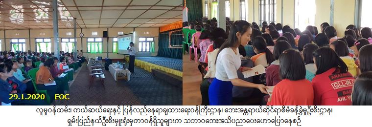 လူမှုဝန်ထမ်း၊ ကယ်ဆယ်ရေးနှင့် ပြန်လည်နေရာချထားရေးဝန်ကြီးဌာန၊ ဘေးအန္တရာယ်ဆိုင်ရာစီမံခန့်ခွဲမှုဦးစီး ဌာန၊ ရှမ်းပြည်နယ်ဦးစီးမှူးရုံးမှတာဝန်ရှိသူများသည် (၂၉-၁-၂၀၂၀) ရက်နေ့၊ (၁၃:၀၀) နာရီအချိန်မှ (၁၄:၃၀) နာရီ အချိန်ထိ ပင်းတယမြို့နယ်၊ အ.ထ.က(ကျုံး) ၌ ကျောင်းသား/သူ (၃၀၀)ဦးကို သဘာဝဘေးအသိပညာပေး ဟောပြောခဲ့ပြီး လက်ကမ်းစာစောင်များဖြန့်ဝေခြင်းနှင့် သရုပ်ပြခြင်းတို့ဆောင်ရွက်ခဲ့ပါကြောင်း သတင်းရရှိ ပါသည်။