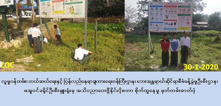 လူမှုဝန်ထမ်း၊ ကယ်ဆယ်ရေးနှင့် ပြန်လည်နေရာချထားရေး၀န်ကြီးဌာန၊ ဘေးအန္တရာယ် ဆိုင်ရာစီမံခန့်ခွဲမှုဦးစီးဌာန၊ မအူပင်ခရိုင်ဦးစီးမှူးရုံးမှ တာဝန်ရှိသူများသည် မအူပင်မြို့၊ ဘုရားလမ်းနှင့် မြို့ရှောင်လမ်းထောင့်၌ စိုက်ထူထားသော ရေဘေးအသိပညာပေးဗွီနိုင်းပို စတာနေရာတွင် မီးဘေးအသိပညာပေး ဗွီနိုင်းပိုစတာအား ( ၃၀ – ၁-၂၀၂၀ ) ရက်နေ့တွင် လဲလှယ်စိုက်ထူခဲ့ကြောင်း သတင်းရရှိပါသည်။