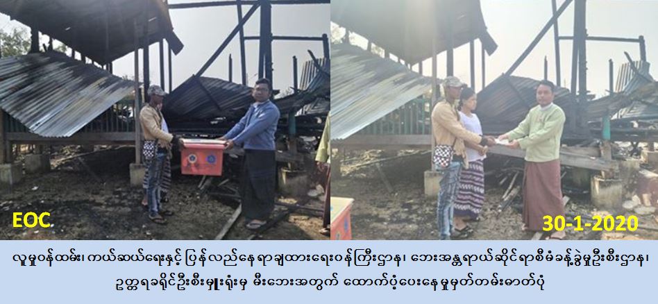 လူမှုဝန်ထမ်း၊ ကယ်ဆယ်ရေးနှင့် ပြန်လည်နေရာချထားရေးဝန်ကြီးဌာန၊ ဘေးအန္တရာယ် ဆိုင်ရာစီမံခန့်ခွဲမှုဦးစီးဌာန၊ ဥတ္တရခရိုင်ဦးစီးမှူးရုံးမှ တာဝန်ရှိသူများသည် ပြည်ထောင် စုနယ်မြေ၊ နေပြည်တော်၊ ပုဗ္ဗသီရိမြို့နယ်၊ ဆင်ဖြူရှင် ရပ်ကွက်၌ ( ၂၉ – ၁- ၂၀၂၀ ) ရက်နေ့ ၊ ( ၁၀ : ၄၅ ) အချိန်တွင် ဖြစ်ပွားသော မီးဘေးကြောင့် လုံးဝပျက်စီးလူနေအိမ် (၁) လုံး အတွက် အိမ်ဆောက်ပစ္စည်းဖိုးရန်ပုံငွေ (၂၀၀, ၀၀ဝိ/-)ကျပ်၊ ဘေးသင့်လူဦးရေ (၂) ဦးအတွက် ဆန်ရိက္ခာဖိုးရန်ပုံငွေ (၄၂၀ဝိ/-) ကျပ် ၊ စုစုပေါင်းရန်ပုံငွေ(၂၀၄၂၀ဝိ/-) ကျပ်နှင့် ကယ်ဆယ်ရေးပစ္စည်း (၁၇) မျိုး၊ (၁) အိမ်ထောင်စုစာတို့အား ပုဗ္ဗသီရိမြို့နယ်၊ အထွေထွေ အုပ်ချုပ်ရေးဦးစီးဌာနမှ ဒုတိယမြို့နယ်အုပ်ချုပ်ရေးမှူးနှင့်အတူ (၃၀- ၁- ၂၀၂၀) ရက်နေ့ ၊( ၁၀ : ၃၀ ) အချိန်တွင် ဘေးသင့်ပြည်သူများလက်ဝယ်သို့ သွားရောက်ထောက်ပံခဲ့ ကြောင်းသတင်းရရှိပါသည်။