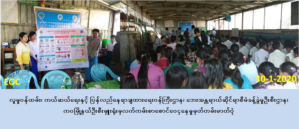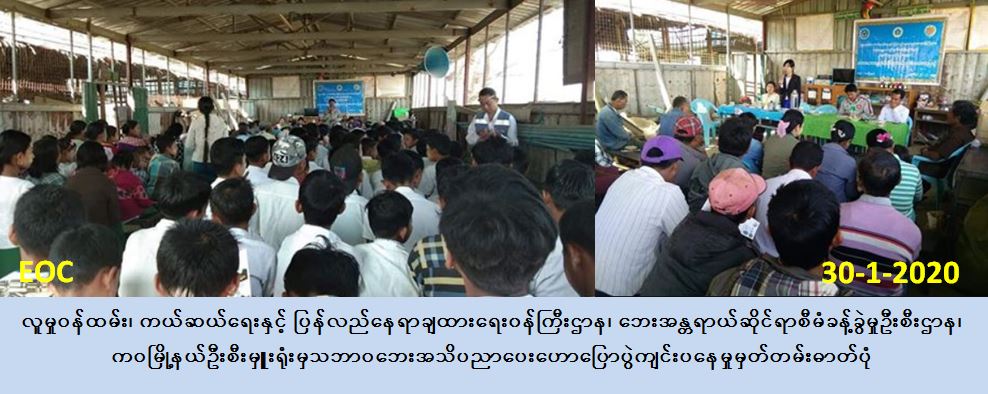 လူမှုဝန်ထမ်း၊ ကယ်ဆယ်ရေးနှင့် ပြန်လည်နေရာချထားရေးဝန်ကြီးဌာန၊ ဘေးအန္တရာယ် ဆိုင်ရာစီမံခန့်ခွဲမှုဦးစီးဌာန၊ ပဲခူးတိုင်းဒေသကြီး၊ ကဝမြို့နယ်ဦးစီးမှူးရုံးမှ တာ၀န်ရှိသူများ သည် (၃၀-၁-၂၀၂၀) ရက်နေ့၊ (၁၃ : ၀၀) နာရီအချိန်မှ (၁၄ : ၃၀) နာရီအချိန်အထိ ပဲခူးခရိုင်၊ ကဝမြို့နယ်၊ အုန်းနှဲကျေးရွာအုပ်စု၊ ဘန်ဒါကွက်သစ်၊ အရိုးပုံကျေးရွာ၊ အလယ် တန်းကျောင်းခွဲတွင် ပြန်ကြားရေးနှင့်ပြည့်သူ့ဆက်ဆံရေးဦးစီးဌာနမှ တာဝန်ရှိသူများ၊ ဘန်ဒါကျေးရွာအုပ်ချုပ်ရေးမှူးနှင့်အတူ ရပ်မိရပ်ဖများ ၊ကျေးရွာများအတွင်းရှိပြည်သူများ၊ ကျောင်းသား/ကျောင်းသူများ၊ ကျောင်းအုပ်ကြီးနှင့် ဆရာဆရာမများ၊ စုစုပေါင်းတက် ရောက်လာသူ(၃၀၀) ဦးခန့်အား ဘေးမဖြစ်မီကြိုတင်ပြင်ဆင်ရေး၊ ဘေးဖြစ်စဉ် တုံ့ပြန် ဆောင်ရွက်ရေးနှင့် ဘေးဖြစ်ပြီး ဆောင်ရန်၊ ရှောင်ရန်များကို ဘေးအန္တရာယ်ဆိုင်ရာ အသိ ပညာပေးဆွေးနွေးဟောပြောခဲ့ပြီး မီးဘေးဗီနိုင်း ၊(မီးဘေး၊ရေဘေး၊ လေဘေးနှင့် ငလျင် ဘေး ပိုစတာများ) အားရပ်ကွက်အုပ်ချုပ်ရေးမှူးသို့ ပေးအပ်ခဲ့ပြီး တက်ရောက်လာသူများ အား လက်ကမ်းစာစောင်များ၊ မုန့်များဝေငှပေးခဲ့ကြောင်းသတင်းရရှိပါသည်။